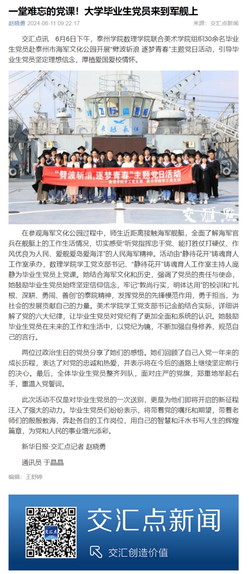 《交汇点新闻》2024年6月11日报道《一堂难忘的党课!大学毕业生党员来到军舰上》,链接:https://jhd.xhby.net/share-webui/detail/s6667a6c9e4b01a918555f853