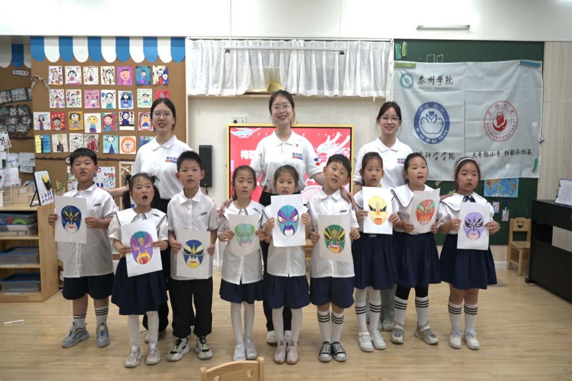 在泰州市海陵幼儿园,团队成员们给幼儿们上了一堂梅兰芳美育思政课。课堂上成员们介绍了梅兰芳先生的生平成就事迹,展示了京剧中著名的脸谱,赢得小朋友们的热烈好评。绘画环节,小朋友们尽情发挥想象力,创作出各具特色的脸谱作品。