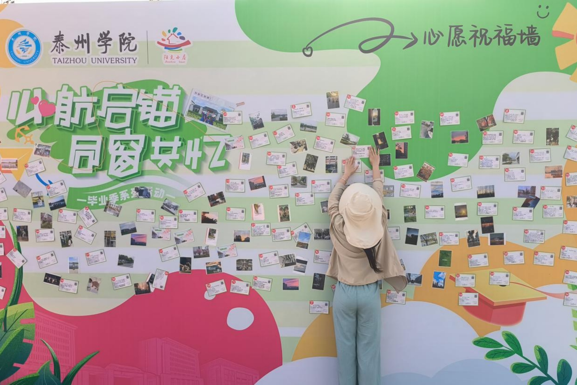 本次活动现场分为三个展区。展区一为心愿祝福墙,来自学弟学妹的祝福温暖了学长学姐的心田。展区二为毕业生旧物展览,昔日的旧物记录着大学生活的点点滴滴,定格了无数幸福的瞬间。展区三为创意气球墙,同学们在气球上自由涂鸦,趣味十足,异彩纷呈的图案彰显了泰院学子的蓬勃朝气,也指向了未来的无限可能。通过活动现场一张张真情流露、满载回忆的照片,毕业生们重拾了在泰院度过的美好时光,感受到了母校之暖、师生之情与青春之美,表达了对学校、对生活的感恩与热爱。