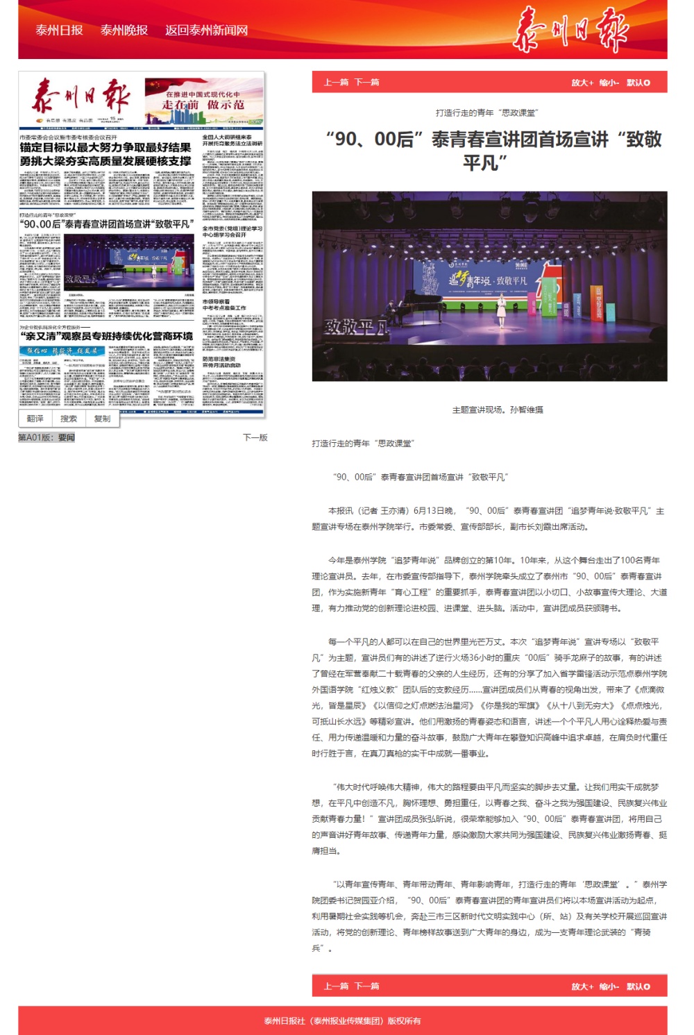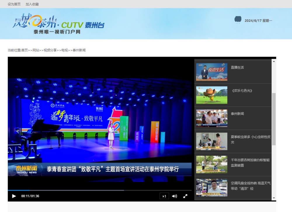 2024年6月15日,《泰州日报》头版、《泰州广播电视台》泰州新闻栏目报道泰青春宣讲团“追梦青年说·致敬平凡”主题宣讲活动,报道链接:
