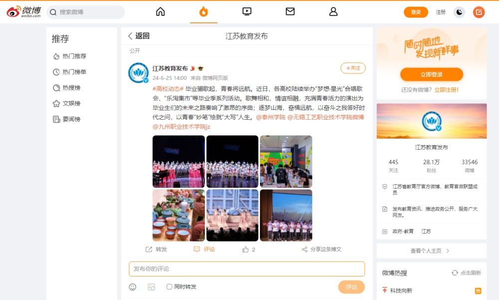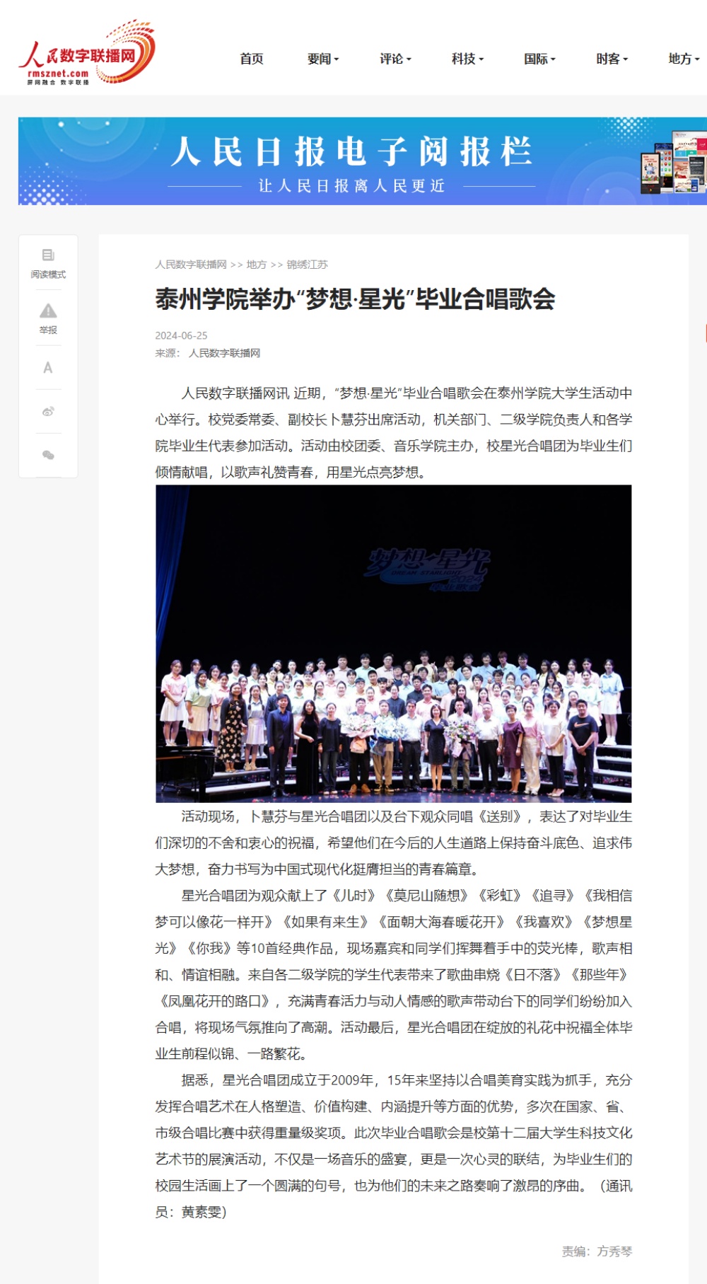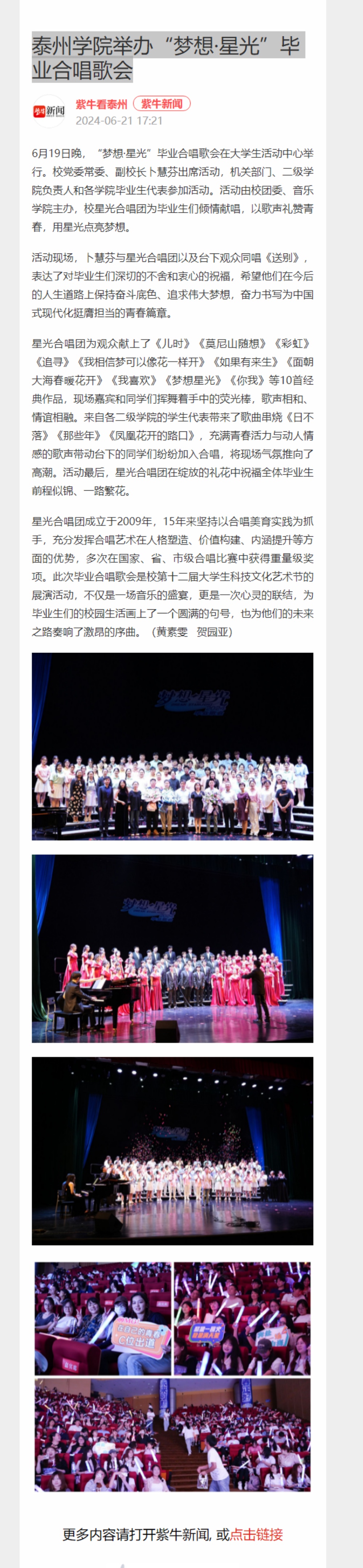 2024年6月21日《紫牛新闻》、6月25日《人民数字联播网》《江苏教育发布》微博分别报道《sunbet申搏官方网站举办“梦想·星光”毕业合唱歌会》。
