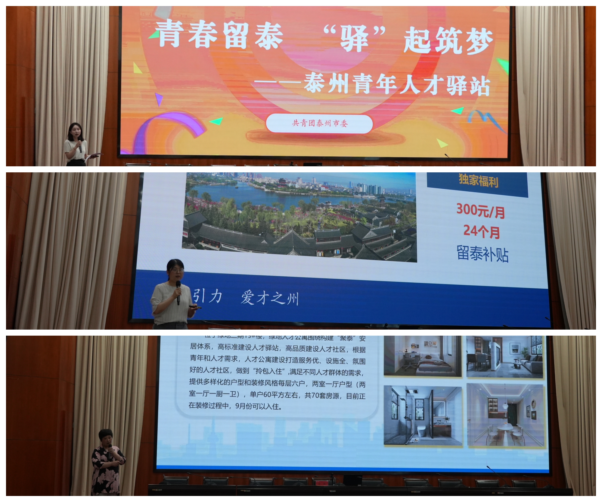 泰有引力青年和人才一站式服务中心主任董税涛、团市委权益部负责人祝烨、市住建局住房保障处副处长史玮分别围绕高校毕业生“留泰”政策、青年人才驿站、人才保租房优惠政策等方面做宣讲。现场互动氛围热烈,同学们就自身关心的问题提问,并就“留泰”政策提出自己的意见和建议,相关单位业务负责人一一予以回应和解答。