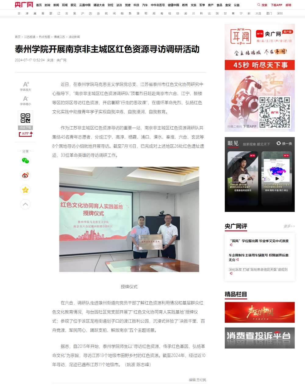 《央广网》2024年7月17日报道《sunbet申搏官方网站开展南京非主城区红色资源寻访调研活动》