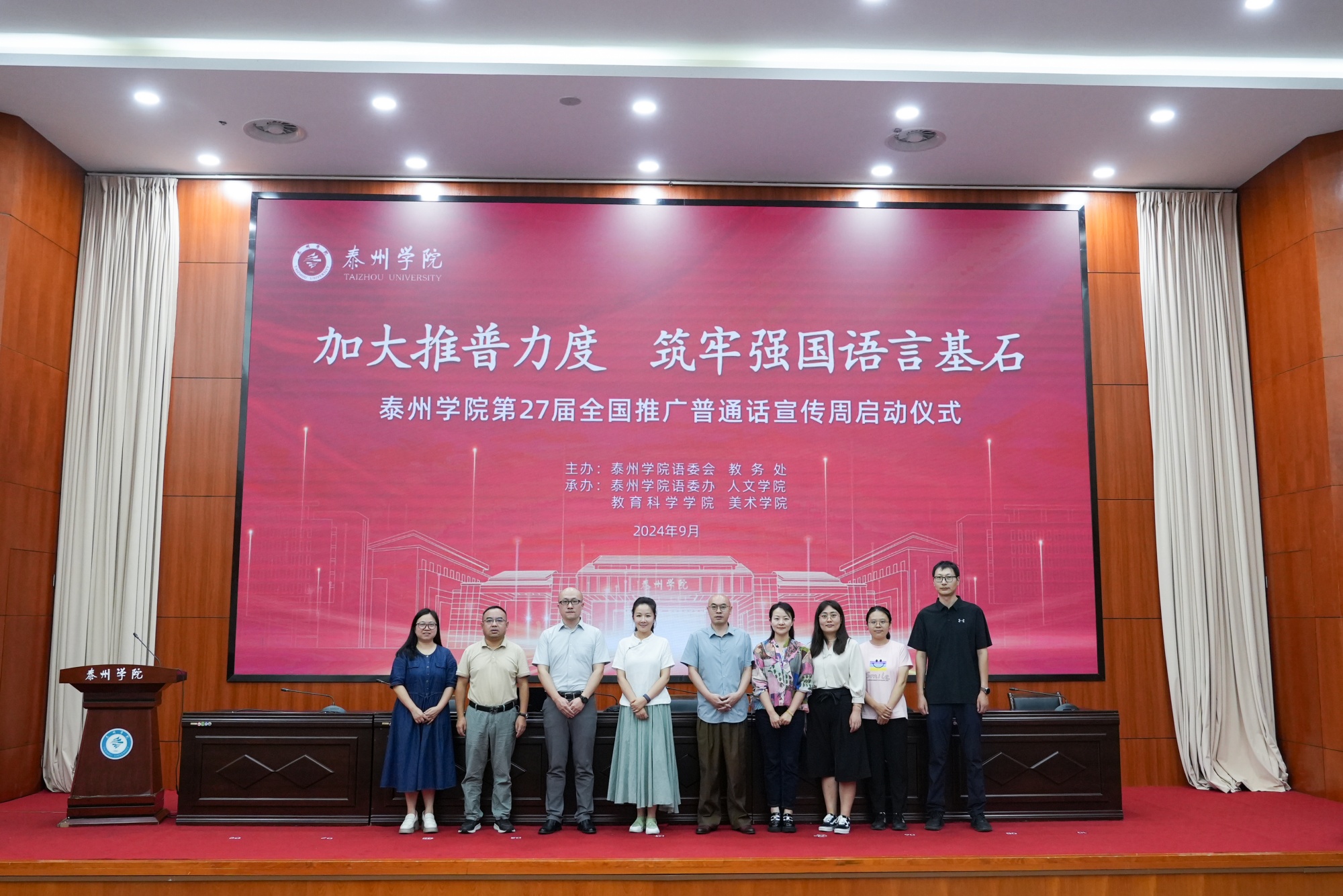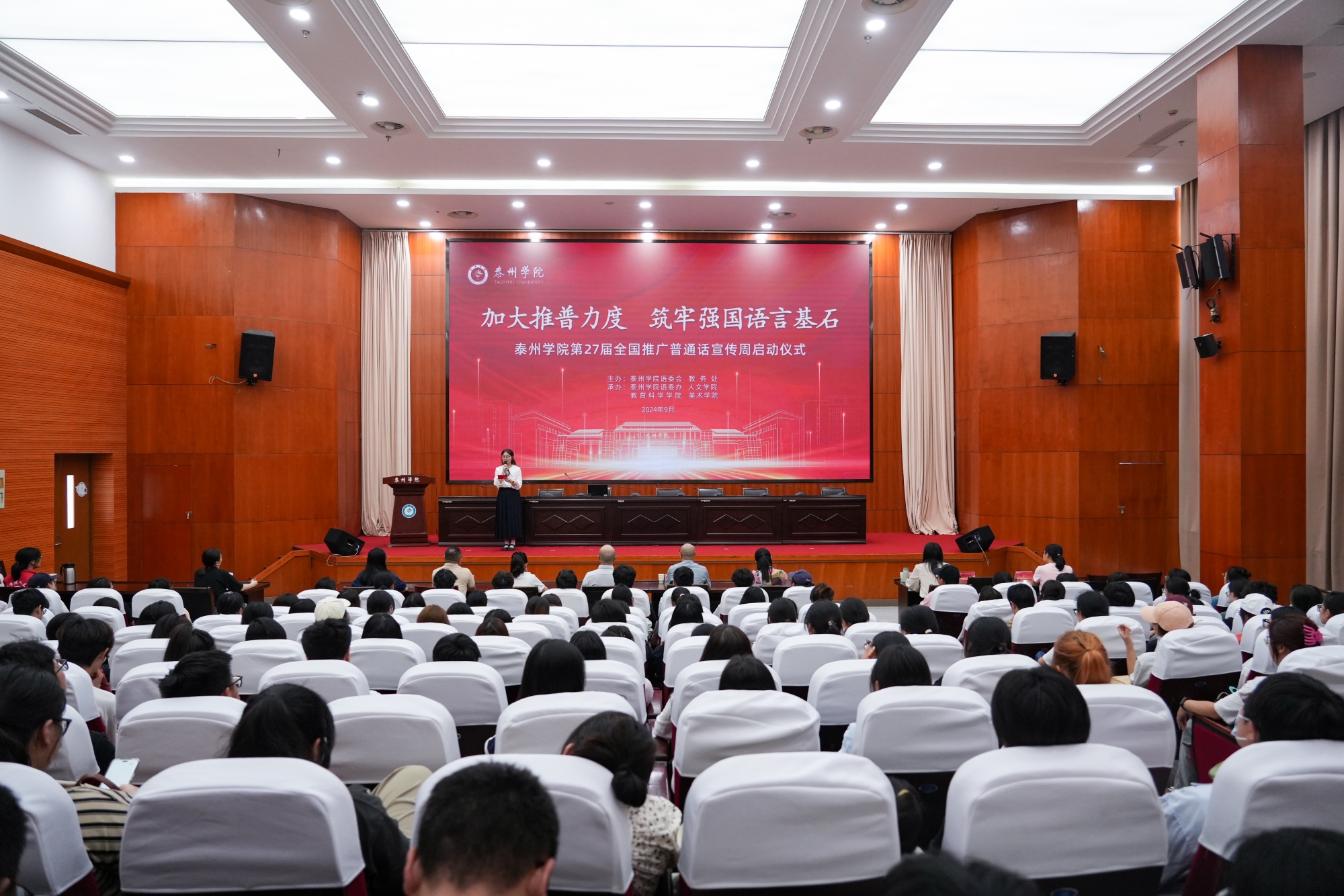 为增强全校师生的语言规范意识和推普参与意识,9月18日下午,sunbet申搏在行政楼D1216会议室举行了推广普通话宣传周启动仪式。泰州市文联秘书长、国家级普通话水平测试员薛悠璐,教务处副处长季恒,人文学院领导班子,以及各二级学院师生代表共200余人参加了启动仪式。