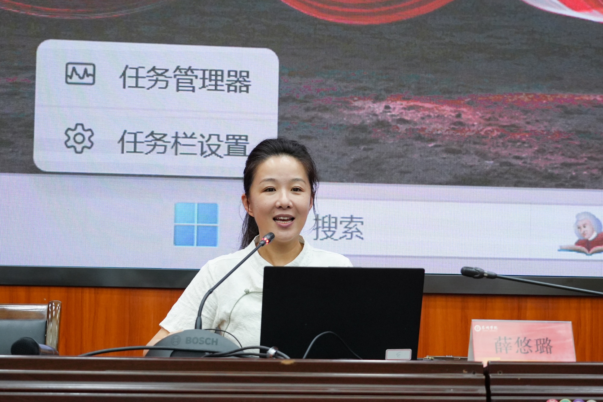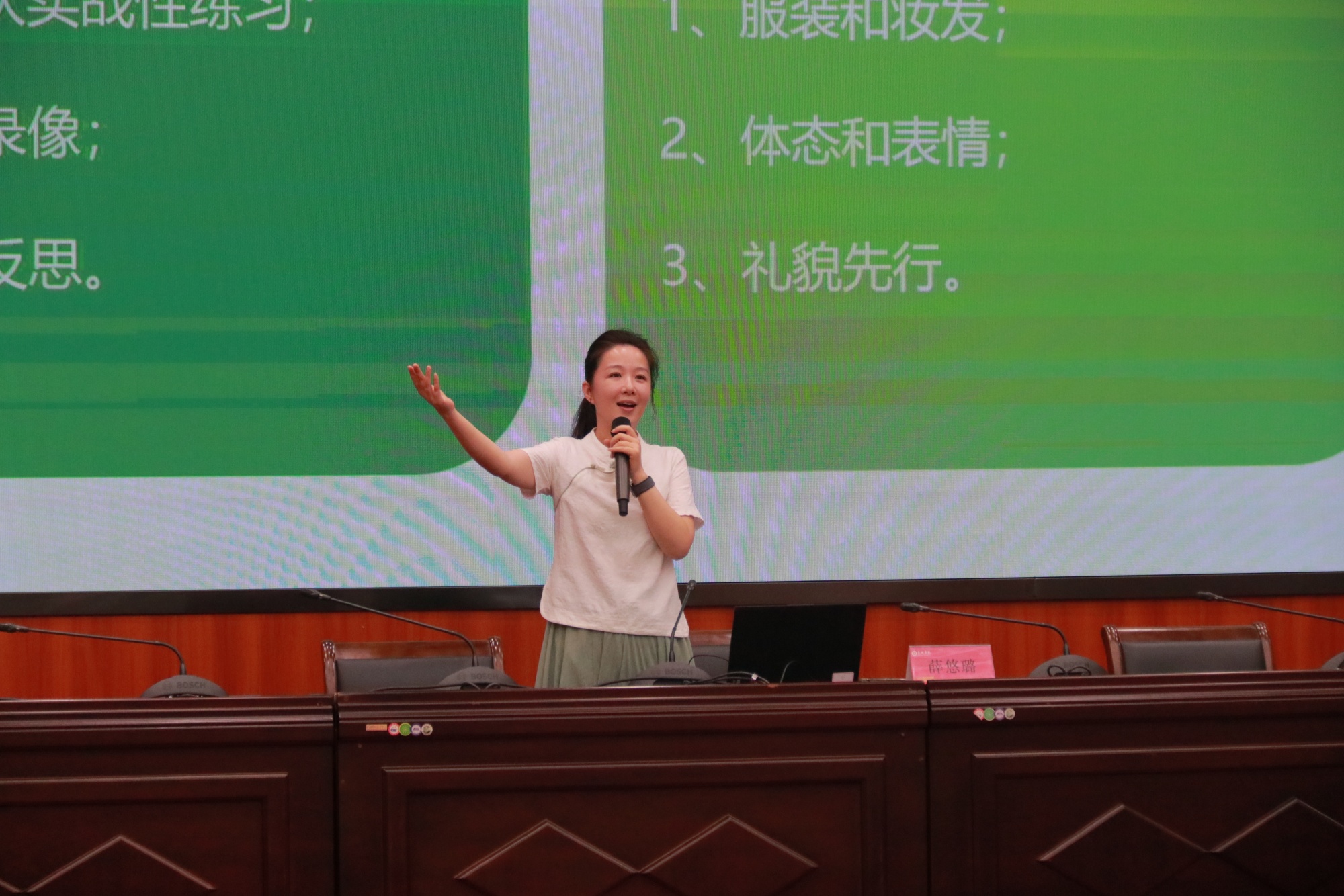 启动仪式现场,薛悠璐带来了一场以“语言艺术的舞台呈现”为主题的精彩讲座。讲座围绕语言艺术的舞台呈现方式、朗诵艺术赏析以及公务口语表达三个方面展开。她用广博的专业知识和生动的案例分析,带领大家感受普通话的魅力。此外,她还为大家提供了在不同场合进行口语表达的建议,如如何克服紧张情绪、如何着装、如何恰当运用背景音乐和肢体动作等。在座师生纷纷表示,本场讲座生动有趣,令人受益匪浅。