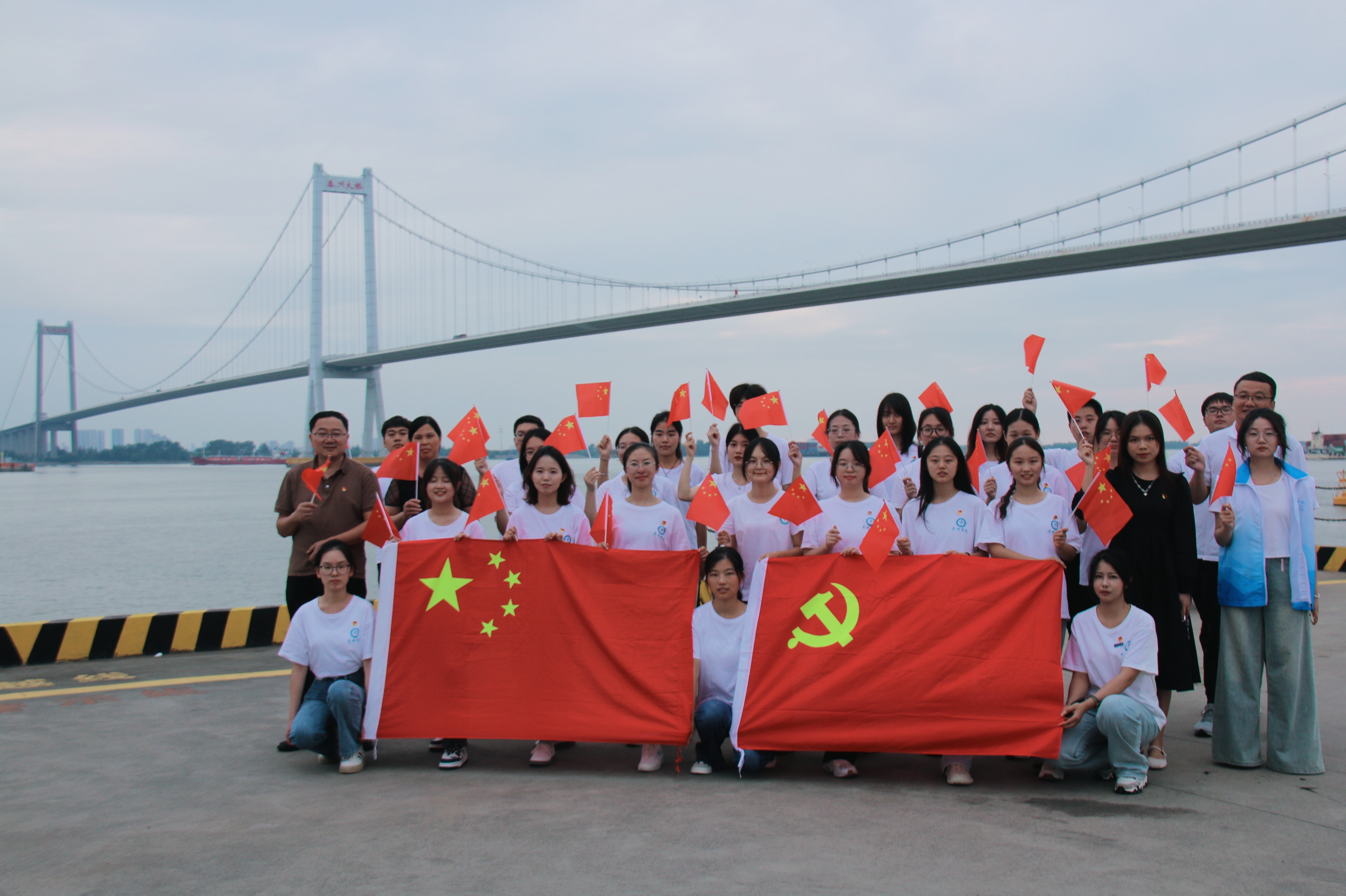 在中华人民共和国成立75 周年之际,外国语学院党总支书记练红珍,党总支副书记、院长李更春,学工党支部师生、部分新生及少数民族学生代表于9月25 日前往泰州大桥开展“红心迎国庆,阔步新征程”主题党日活动。