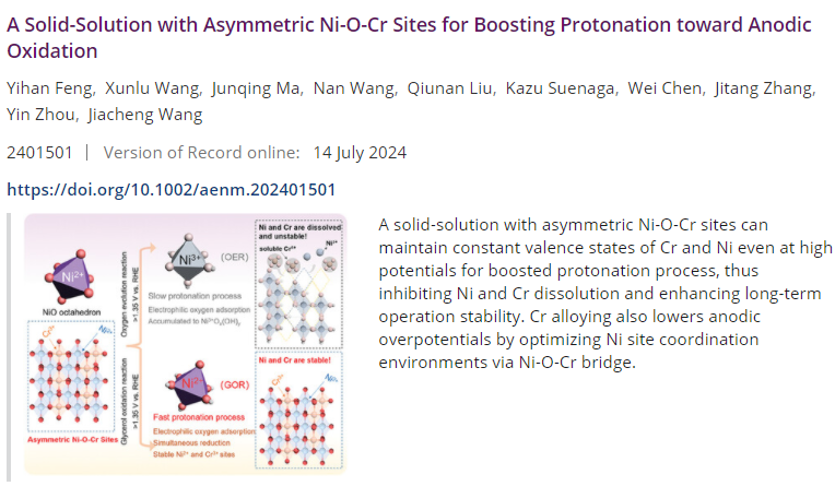 近日,机电工程学院周银博士在新能源器件研究领域取得重要进展,其作为通讯作者在TOP期刊《Advanced Energy Materials》(IF=24.7,中科院1区)发表题为“A Solid-Solution with Asymmetric Ni-O-Cr Sites for Boosting Protonation toward Anodic Oxidation”的研究论文。《Advanced Energy Materials》期刊一直致力于在能量收集、转换和储存领域发表最新研究论文,为全球当前的能源挑战提供解决方案。