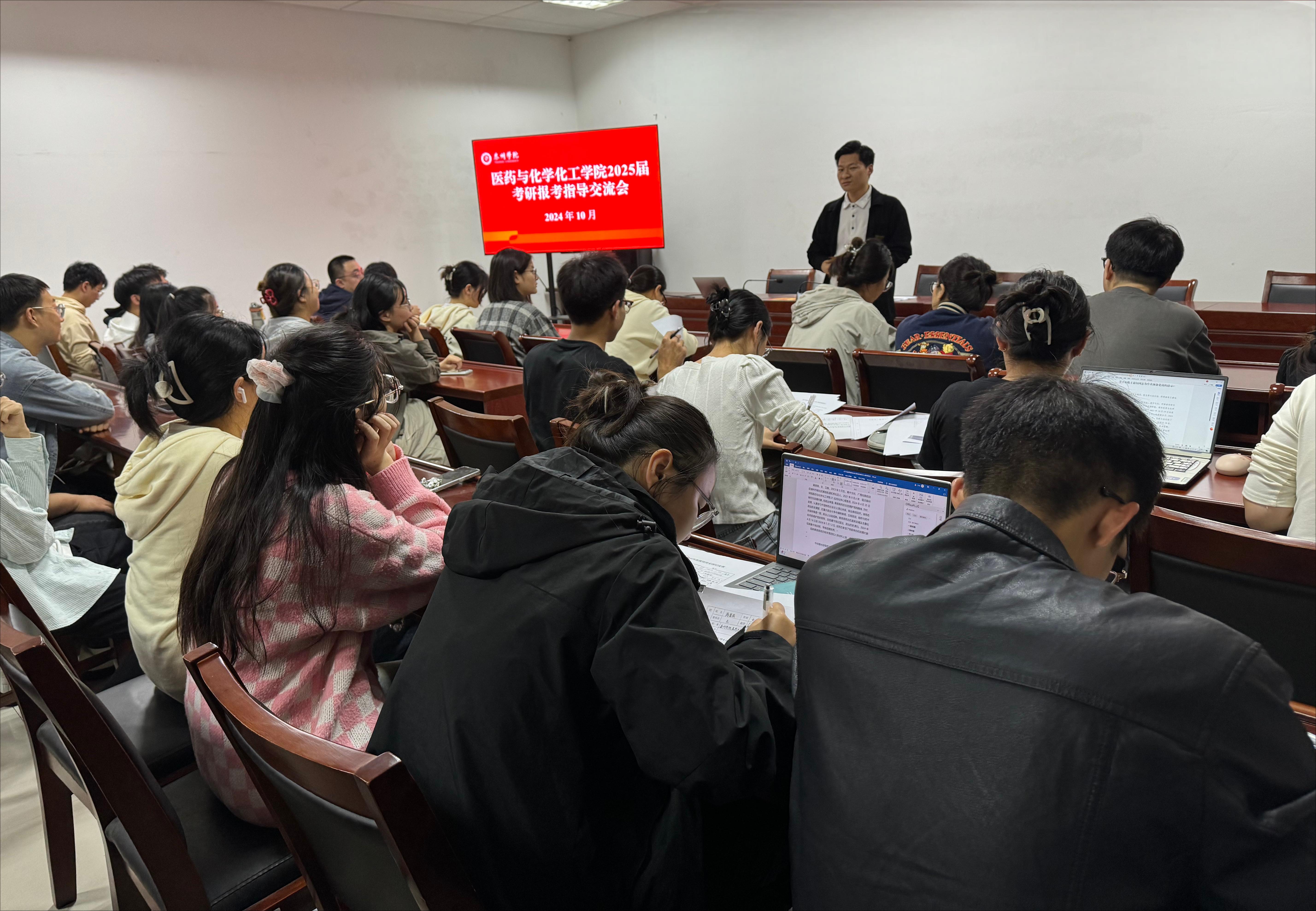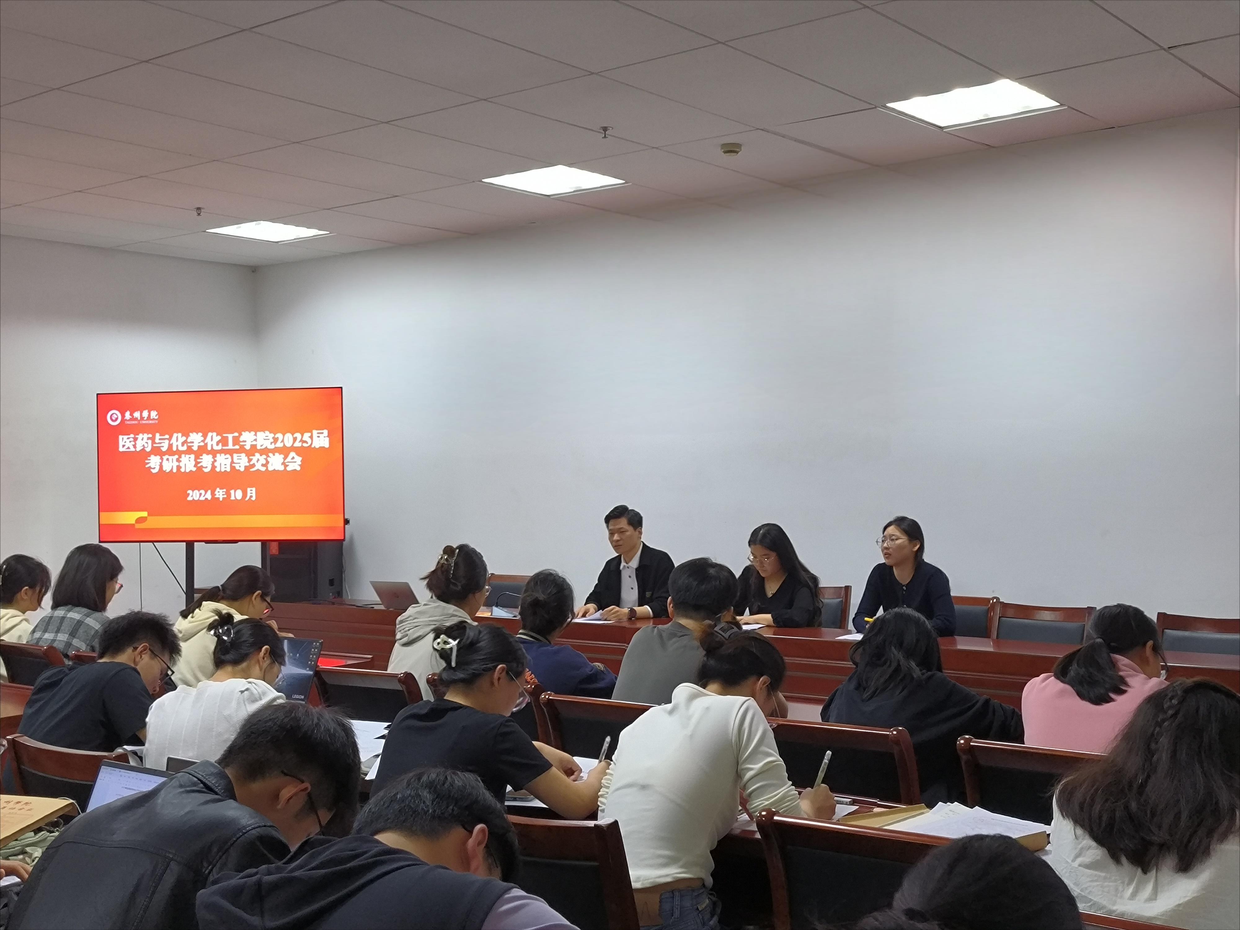 考研报名在即,为帮助考研学生进一步明确考研目标院校和报考流程,减缓报考压力,坚定备考信心,10月14日,医药与化学化工学院举办“筑梦研途,暖心引航”2025届考研报考指导交流会,院学生工作办公室主任高菲晨、毕业班辅导员、助研导师代表以及考研学生参加活动。