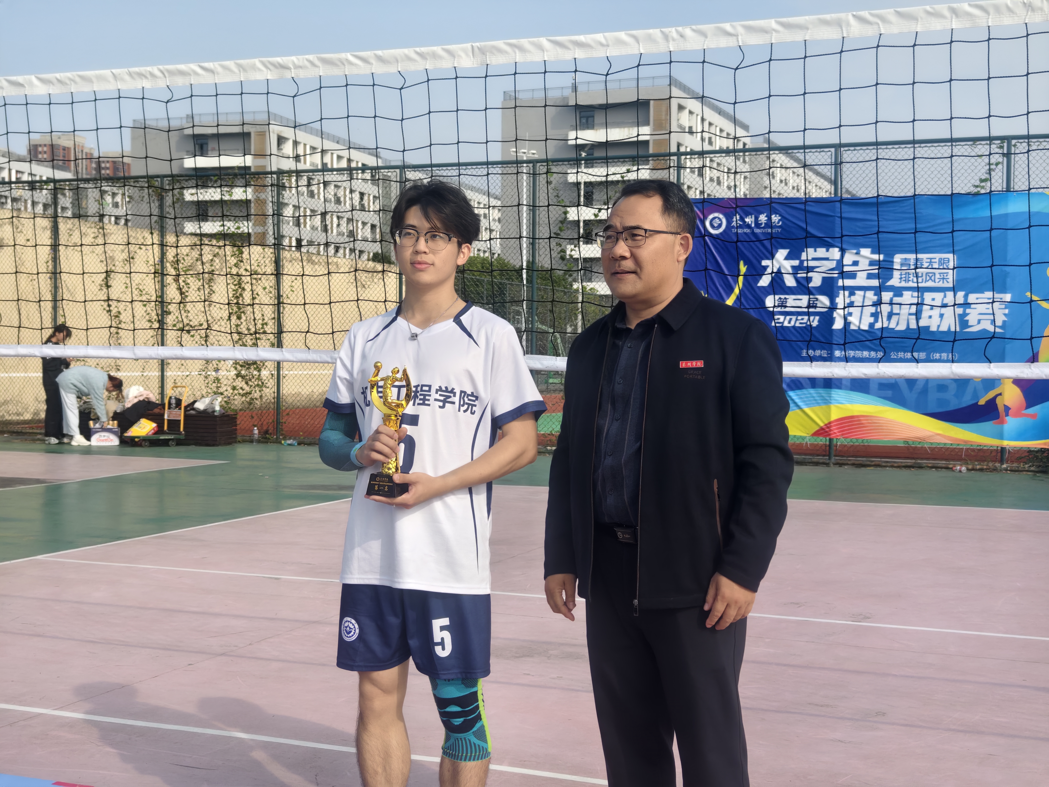 赛后,闭幕式在排球场举行。学工处处长陈茂国、教务处处长黄华、公共体育部主任赵益鑫以及公体部部分教师参加了闭幕式。陈茂国为获奖队伍颁发奖杯与证书。黄华对所有参赛队伍表示祝贺,对裁判员、工作人员及志愿者的辛勤付出表示感谢,他强调,本次联赛不仅是一次体育竞技的盛会,更是展现泰院学子团结协作、勇于拼搏精神的重要平台。赵益鑫鼓励同学们继续发扬体育精神,积极参与各类体育活动,锻炼身体,增强体质,为推动校园体育文化建设贡献自己的力量。