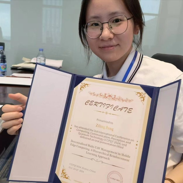 2024年10月25日至27日,sunbet申搏官方网站信息工程学院大三学生彭紫凌同学在珠海参加了第三届计算、通信、感知与量子技术国际会议(CCPQT 2024),全英文宣讲了学术论文,并与众多学者就移动边缘计算相关学术问题进行了科学研讨。