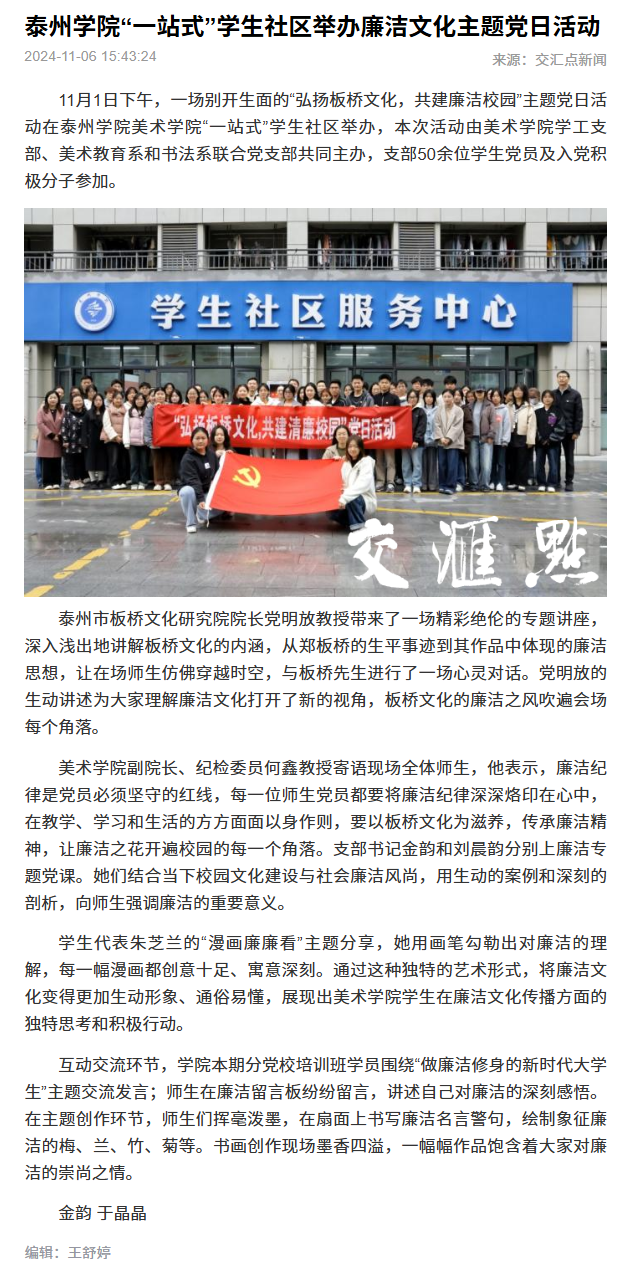 交汇点新闻11月6日报道sunbet申搏“一站式”学生社区举办廉洁文化主题党日活动