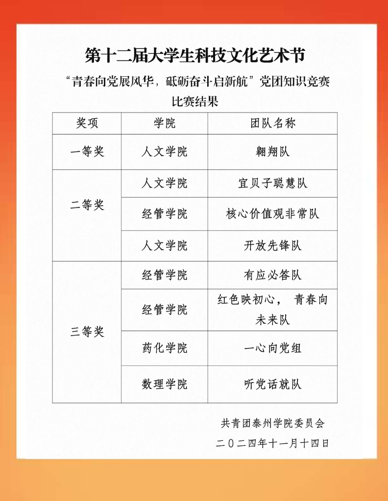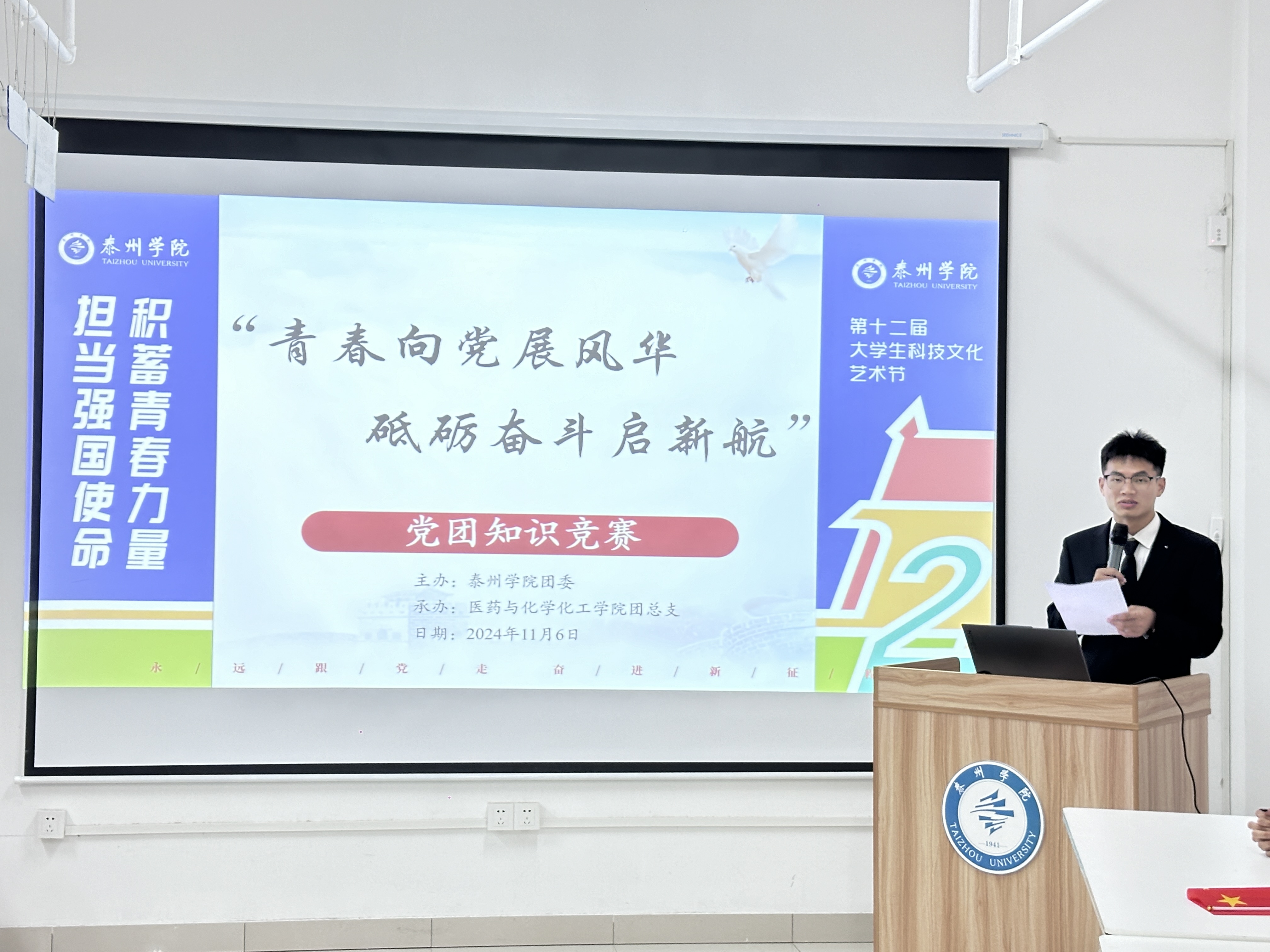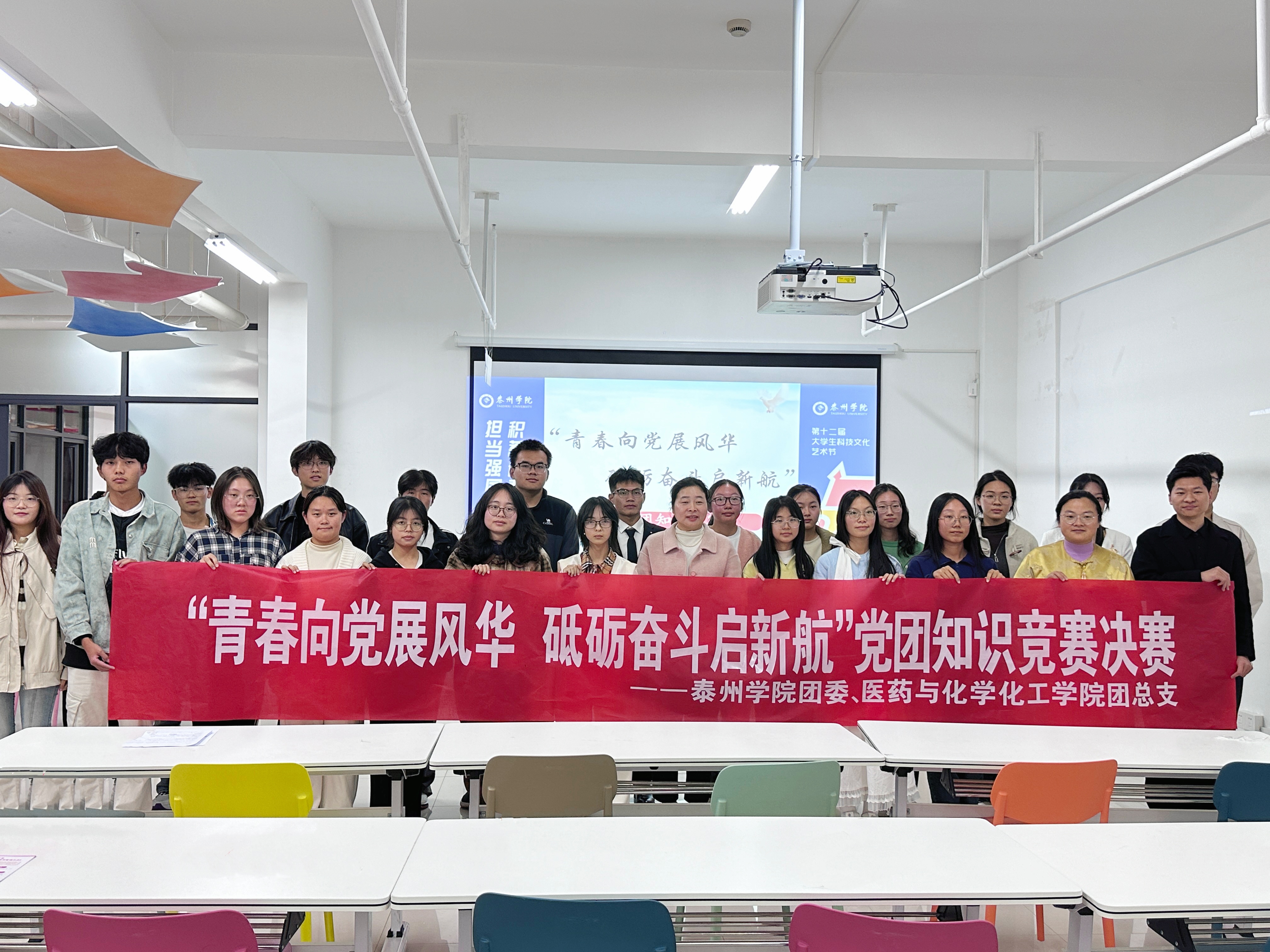 为进一步学习宣传贯彻习近平新时代中国特色社会主义思想和党的二十大、二十届三中全会精神,11月6日下午,由校团委主办、医药与化学化工学院团总支承办的“青春向党展风华,砥砺奋斗启新航”党团知识竞赛在“一站式”学生社区举行。海陵区市场监督管理局特化科科长曹媛媛、海陵区市场监督管理局四级高办蒋霁、海陵区城南街道新高桥社区主任葛丹萍、医药与化学化工学院团总支书记高菲晨担任评委,各学院学生代表参加活动。
