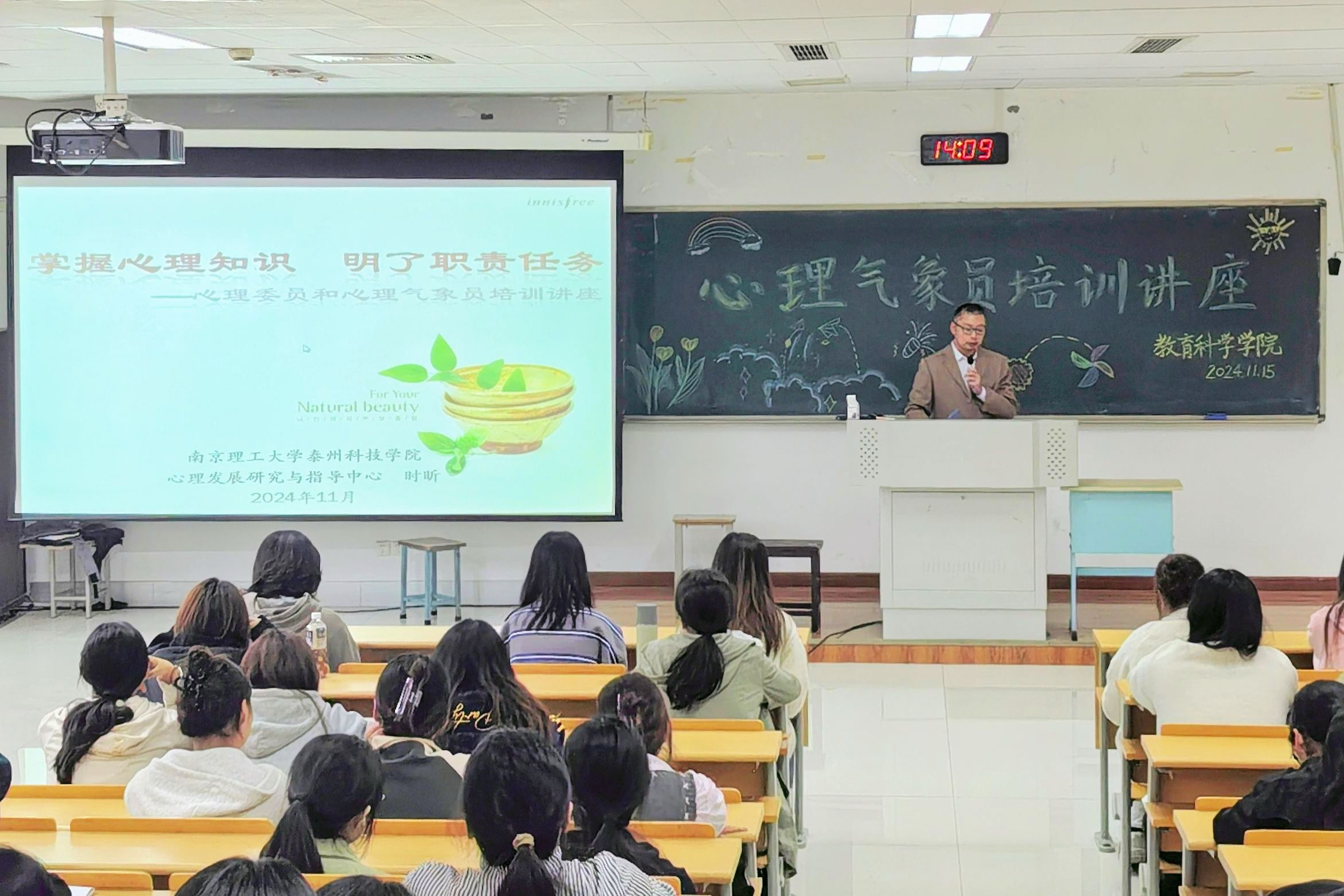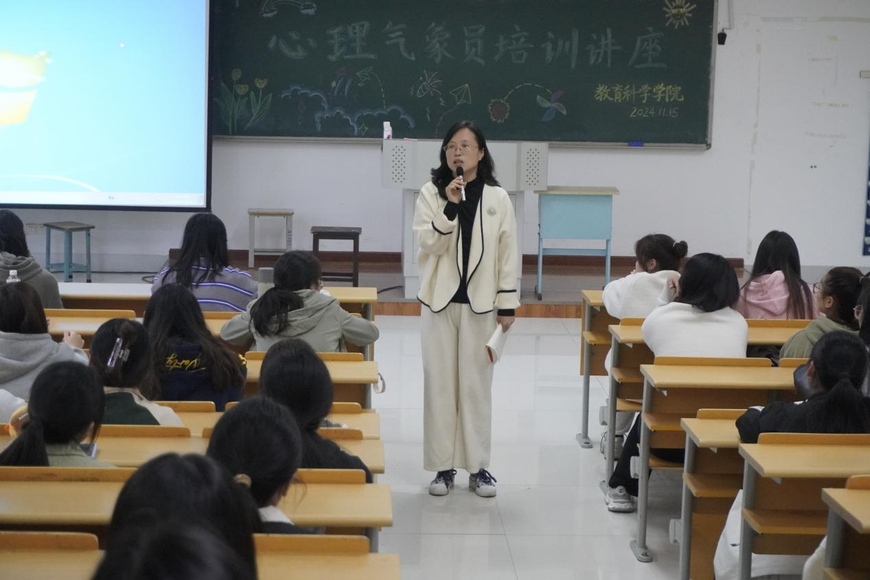 为切实加强心理健康教育工作,提升心理委员和心理气象员的专业素养与责任意识,夯实心理健康教育四级网络体系。11月15日下午,教育科学学院邀请南京理工大学泰州科技学院心理发展研究与指导中心时昕主任在教学楼A2207,举办以“掌握心理知识,明了职责任务”为主题的心理委员和心理气象员培训。本次讲座由该院党总支副书记、副院长孙晓敏主持。教育科学学院各班心理委员和心理气象员200余人参加活动。