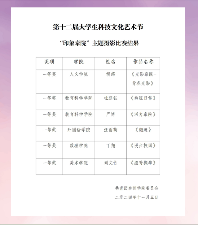 在本次比赛中,泰院学子们通过摄影镜头,将学校的一草一木、一砖一瓦以及校园中发生的点滴故事进行定格,令 “扎根、深耕、勇闯、善创” 从抽象的表述里挣脱出来,转变成一幕幕满溢情感与人文关怀的生动影像。本次活动助推泰院精神更加深入人心,激励着每一位师生去传承与践行。