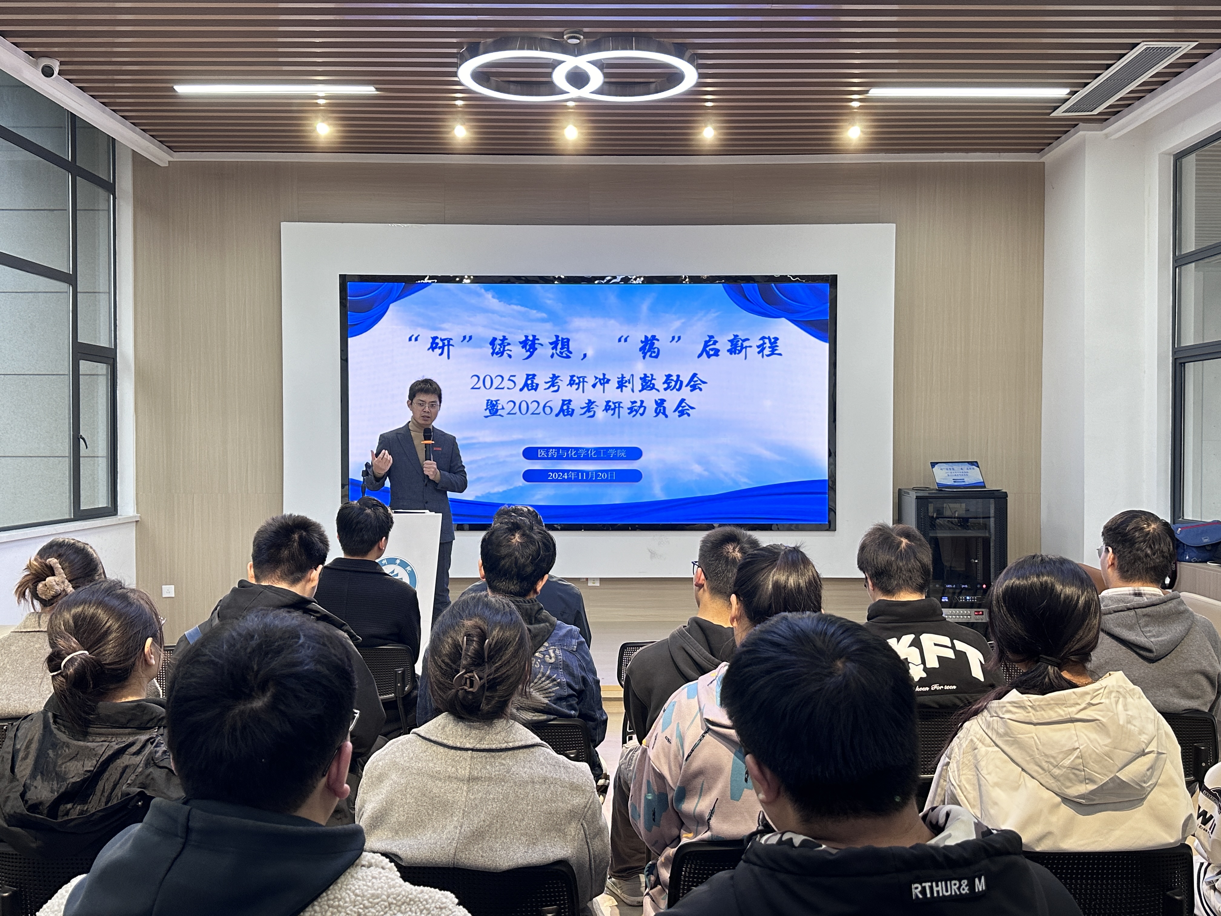 为进一步鼓励考研学生积极迎考、增强自信、坚定决心,实现考研“传帮带”,11月20日,医药与化学化工学院在校就业服务站举办“‘研’续梦想,‘药’启新程”2025届考研冲刺鼓劲会暨2026届考研动员会, 学院党总支书记朱诚,党总支副书记张红祥,团总支书记高菲晨,年级辅导员、考研学生代表出席活动。