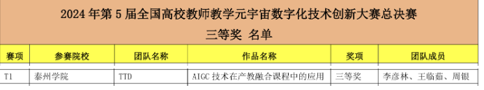 11月23日,第5届全国高校教师教学元宇宙数字化技术创新大赛全国总决赛落下帷幕,sunbet申搏机电工程学院联合贯通培养项目合作校——泰州职业技术学院智能制造学院共同打造三个团队参赛,团队经过项目报告、讲解、说课、答辩等多个环节的激烈角逐,最终取得优异成绩:“专注仿真技术队”(团队成员:徐晓栋、许胜、俞冬平、李卫民)、“爱3D创作队”(团队成员:龚玉玲、周银、王小羊、张斌)荣获国家级二等奖,“TTD队”(团队成员:李彦林、王临茹、周银)荣获国家级三等奖。