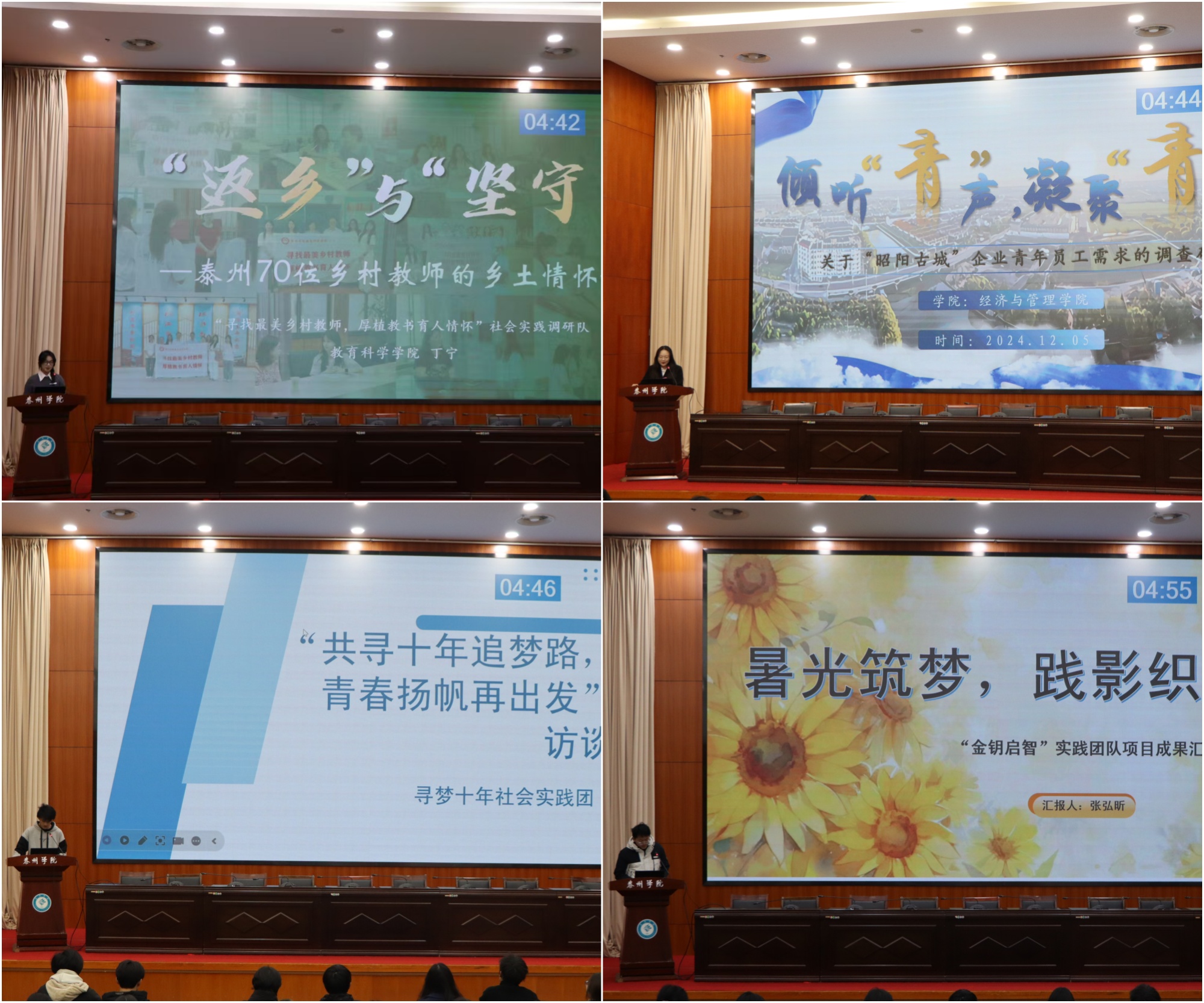 分享会上,各团队围绕爱国主义教育、乡村振兴、科创强国等多个主题,讲述了暑期社会实践的丰富历程,展示了在社会实践工作中激扬青春、奉献社会的奋进姿态。泰院青年们在实践中厚植爱国情怀,筑牢信仰坐标;大兴调查研究,体悟改革发展;深耕乡野沃土,助力乡村振兴;传承“泰院”精神,践行基层服务......他们深度参与社会实践了解国情社情、增强时代责任、服务基层群众、提高社会化能力,上好与现实紧密结合的“大思政课”。