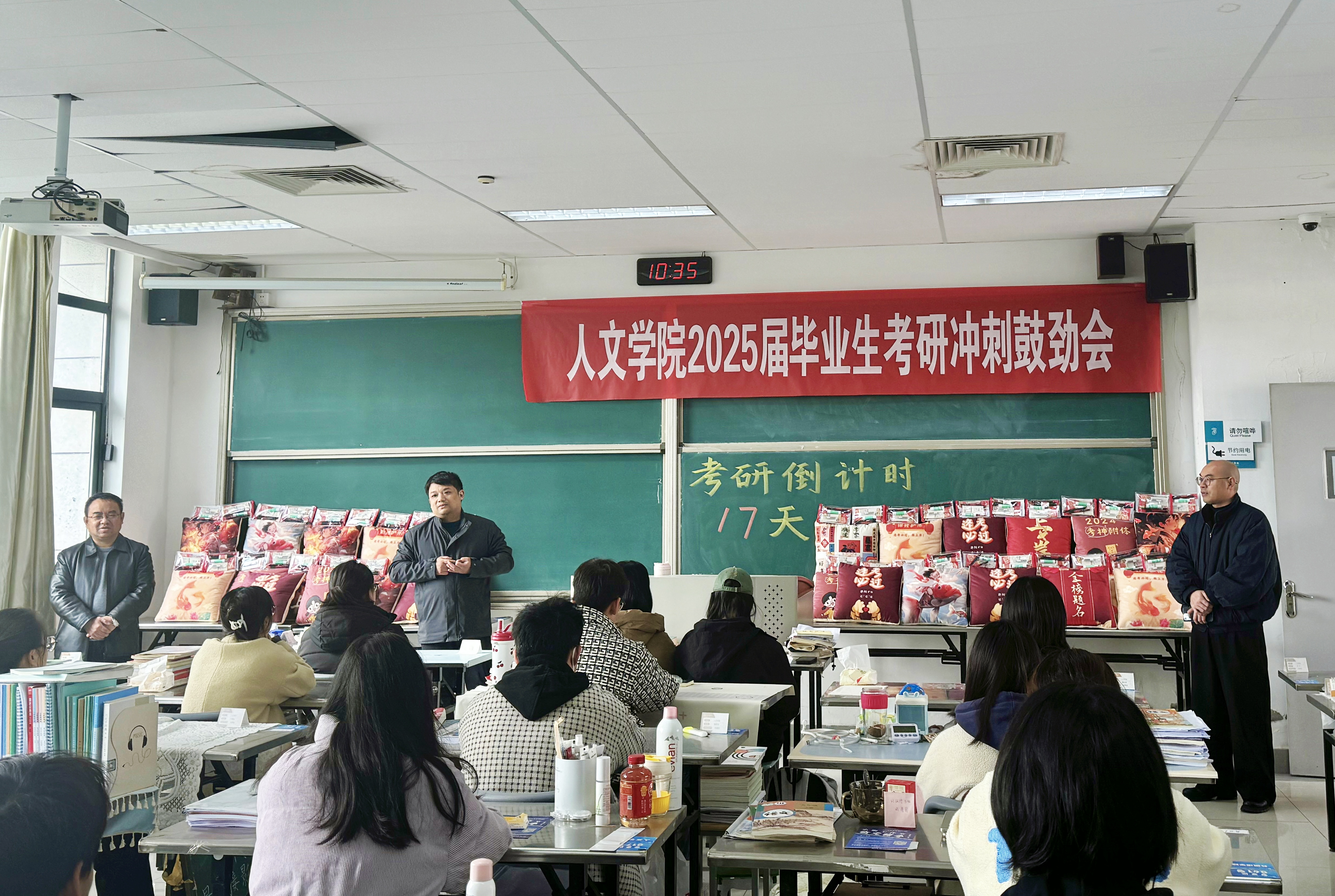 鼓劲会上,老师们为2025届考研学生发放考研慰问品,将“金榜题名”“成功上岸”等一系列带有美好祝愿的抱枕被和文具袋送给学生,预祝大家考试顺利、前程似锦。