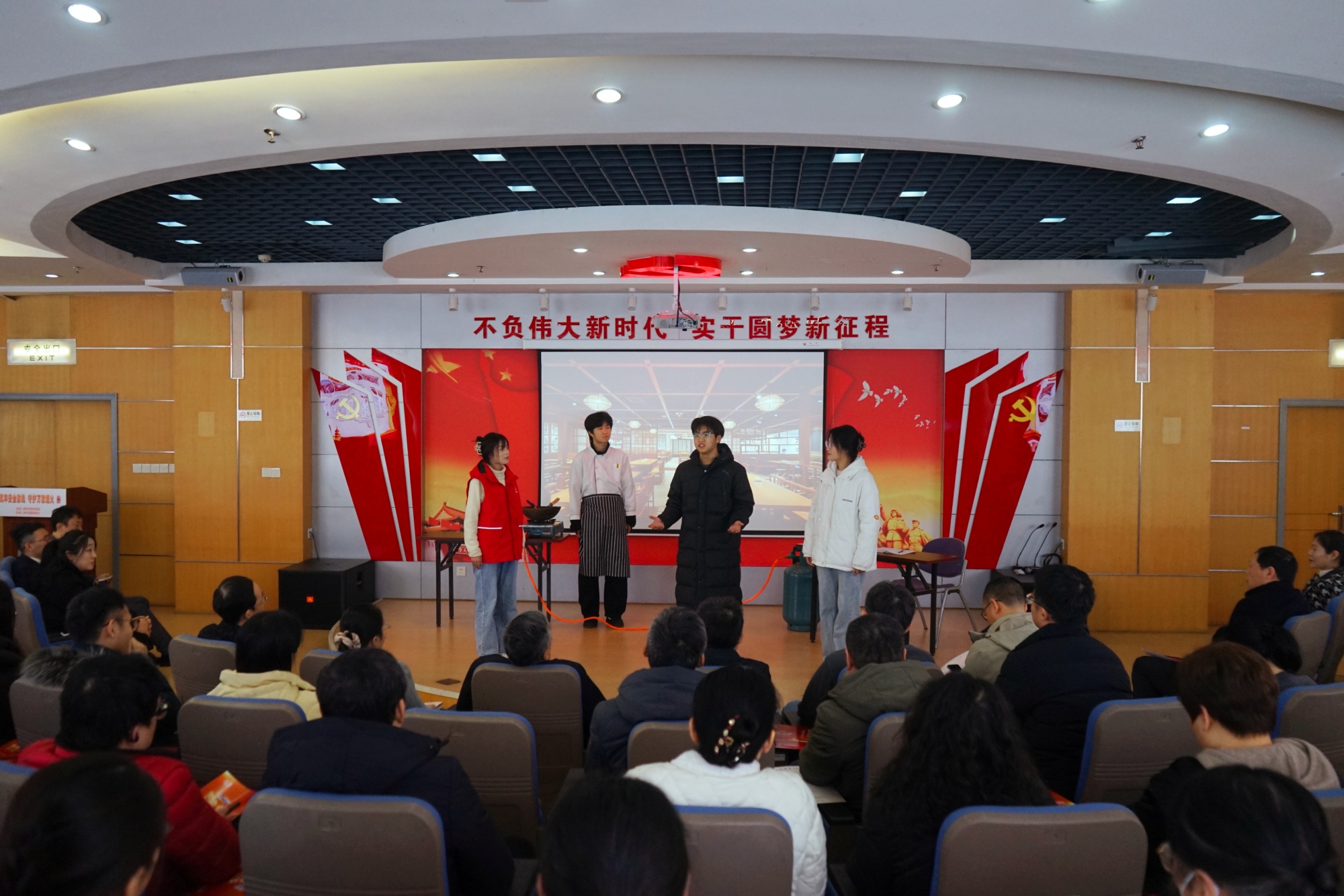 12月26日上午,应市住建局邀请,人文学院2023级汉语言文学(师范)专业3班4位同学精心编排的“管电齐推,平安泰州”小品走进市住建局道德讲堂,为住建系统的干部职工们进行展演。