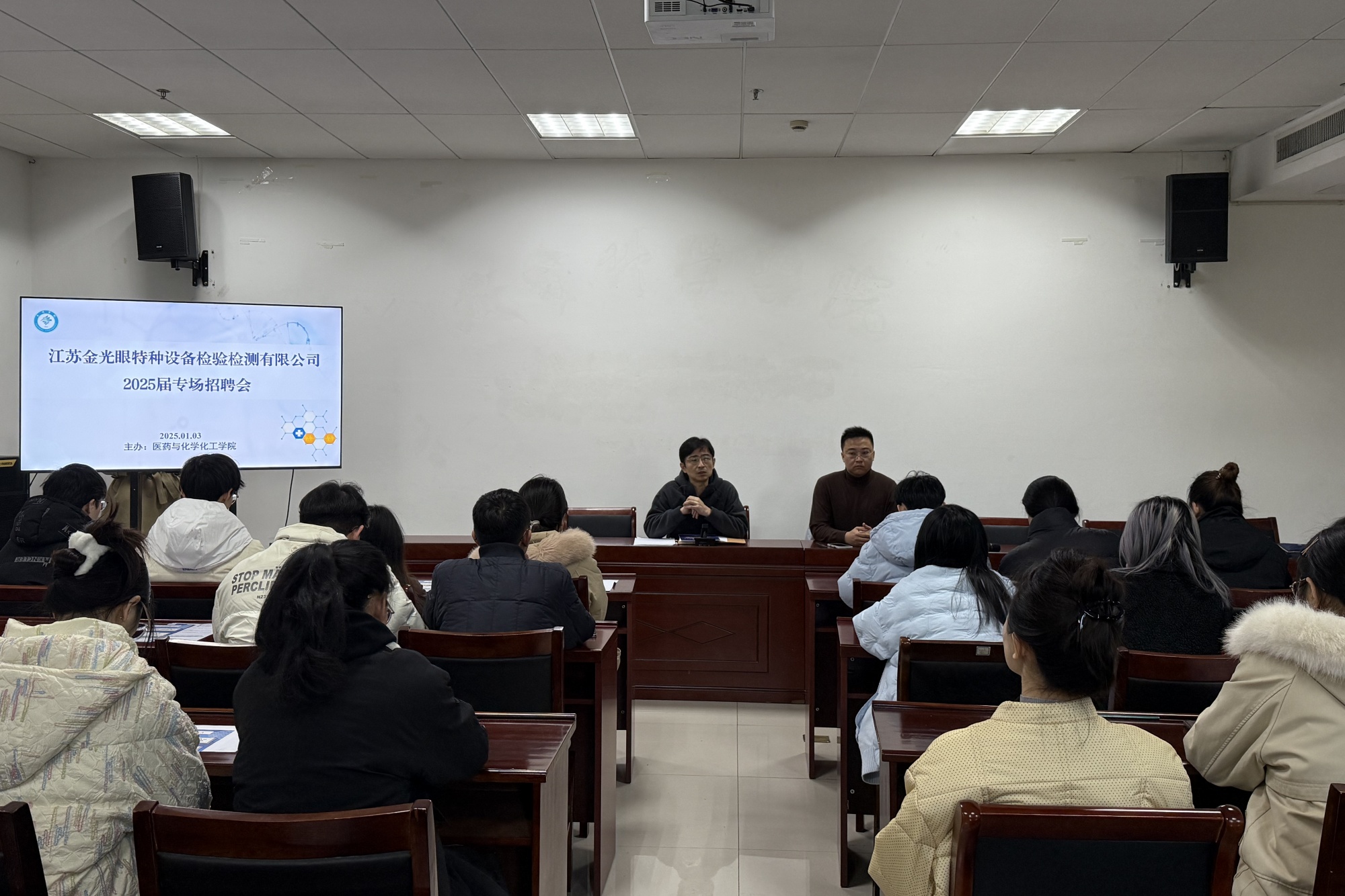 为贯彻《教育部关于做好2025届全国普通高校毕业生就业创业工作的通知》精神,认真落实学校党委关于持续抓好稳就业的工作指示要求,进一步拓宽毕业生就业渠道,促进供需匹配精准对接,2025年1月3日,医药与化学化工学院联合机电工程学院,邀请江苏金光眼特种设备检验检测有限公司到校举办专场招聘会。公司董事长朱建文、学院党总支书记朱诚、院长牟伊等出席活动。