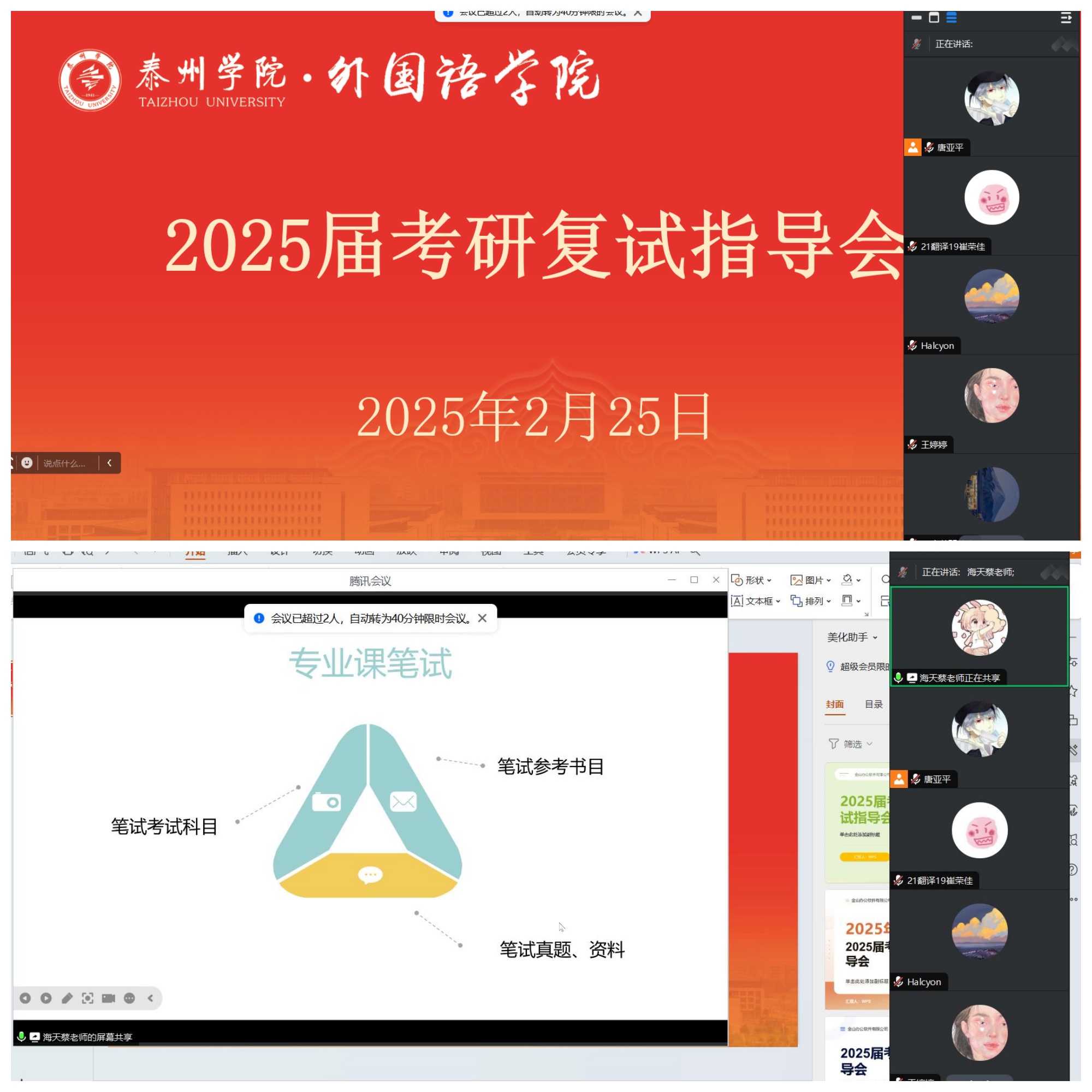 为了帮助2025届考研学生做好复试、调剂准备工作,提高复试及调剂成功率,2月25日、26日,外国语学院分别举办了考研复试和调剂线上线下指导。学院院长李更春、党总支副书记全小军、就业辅导员和考研学生参加活动。