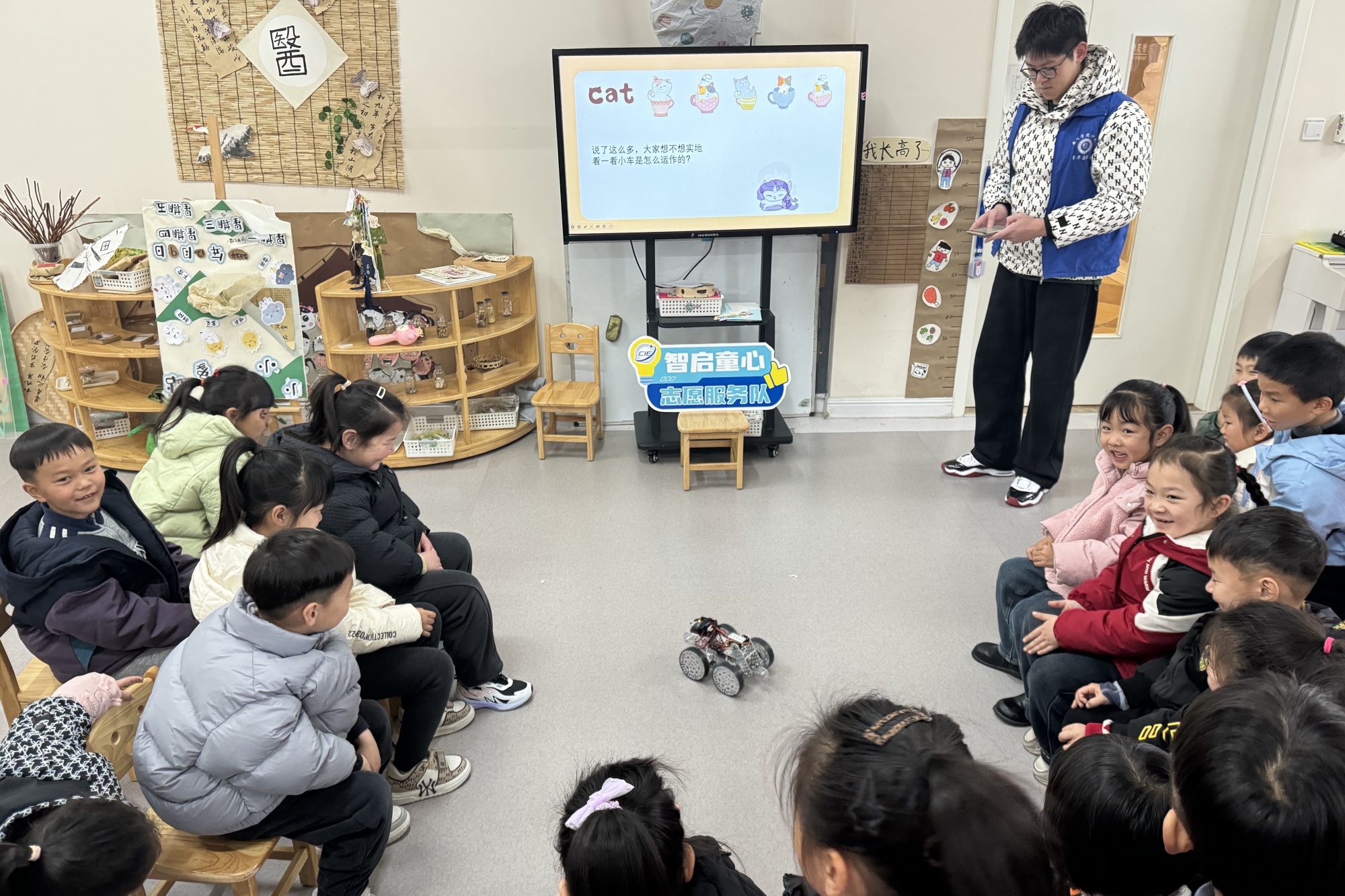 最富童趣的“智启童心”服务队,在星威园幼儿园开展科技启蒙。通过科技宣讲、互动体验和科普游戏等环节,志愿者们将复杂的计算机原理转化为妙趣横生的互动游戏。当稚嫩的小手点击第一组程序,当童声指令唤醒智能小车,孩子们脸上洋溢着激动的笑容。