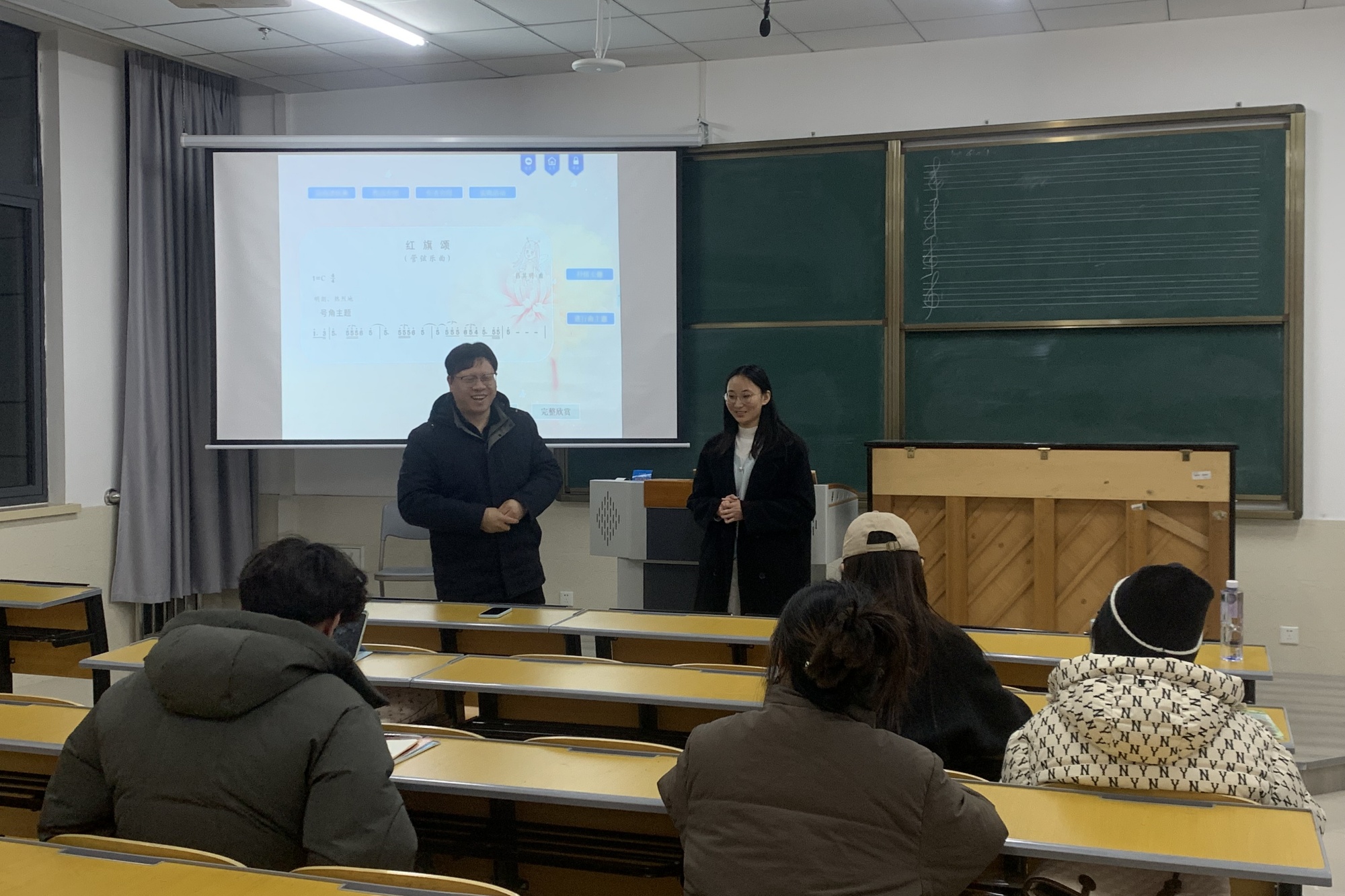 聚焦教学设计,强化实践能力。泰州市海陵区音乐教研员、教学督导陈亚彬老师立足新课标要求,以《江苏省中小学音乐学科单元教学设计方案》为蓝本,详细讲解了单元学习目标设定、教学流程设计及多元化评价体系的构建方法。陈亚彬老师通过真实教学案例展示,引导学生理解教学设计中的创新思维与学科融合要点。在“实战演练”环节,学生依次登台试讲并展示自弹自唱技能,老师逐一进行针对性点评,从教态语言到课堂互动,再到音乐表现力,提出优化建议,助力其提升教学实践能力。