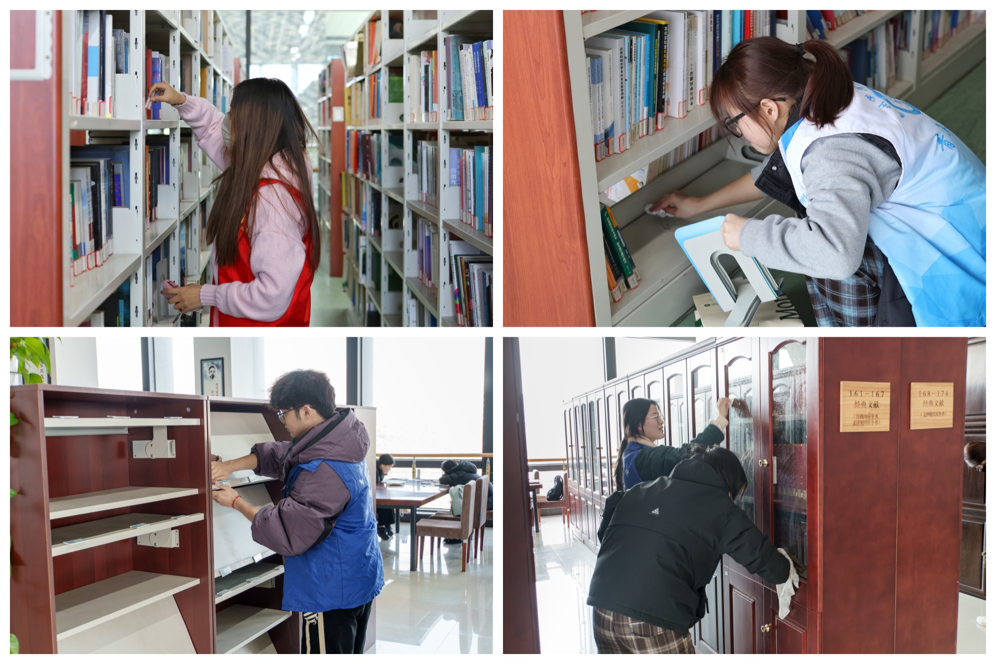 100多名学生志愿者参加活动,他们对书报架积尘、阅览桌及地面死角展开深度清理。经过近1小时的协作,图书馆阅览区的书报架、阅览桌及公共空间环境焕然一新。