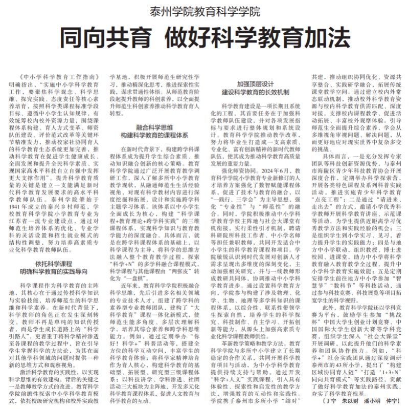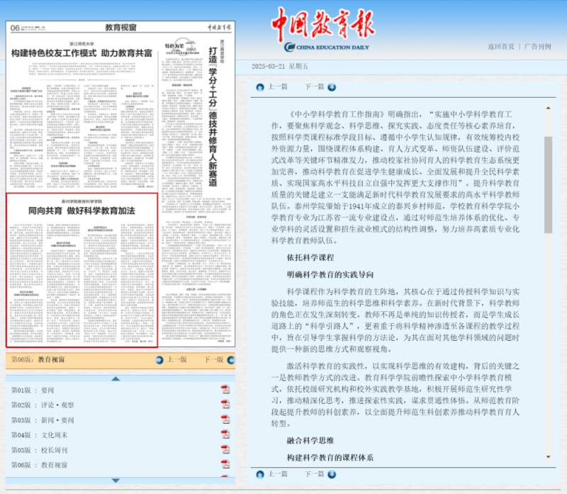 《中国教育报》2025年3月21日报道《sunbet申搏官方网站教育科学学院 同向共育 做好科学教育加法》