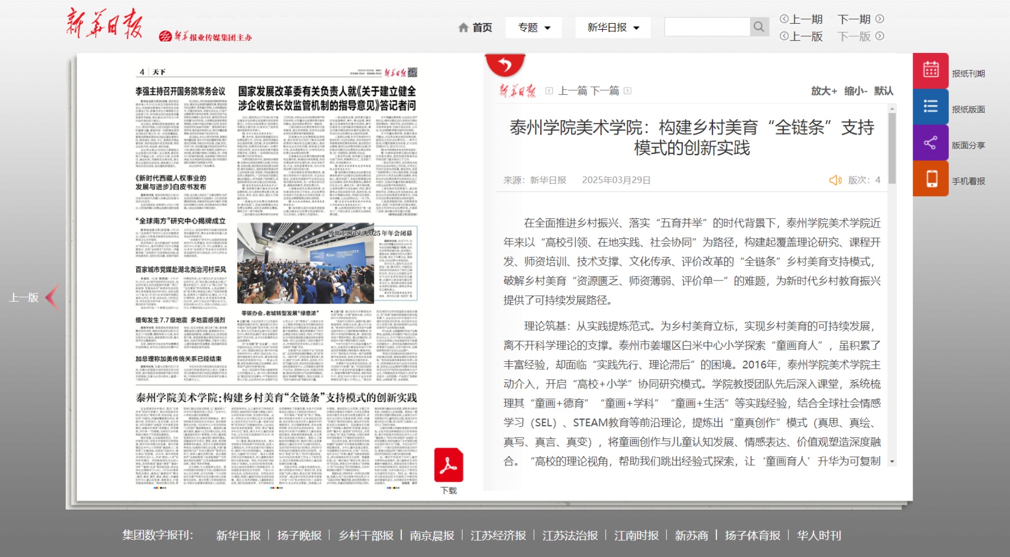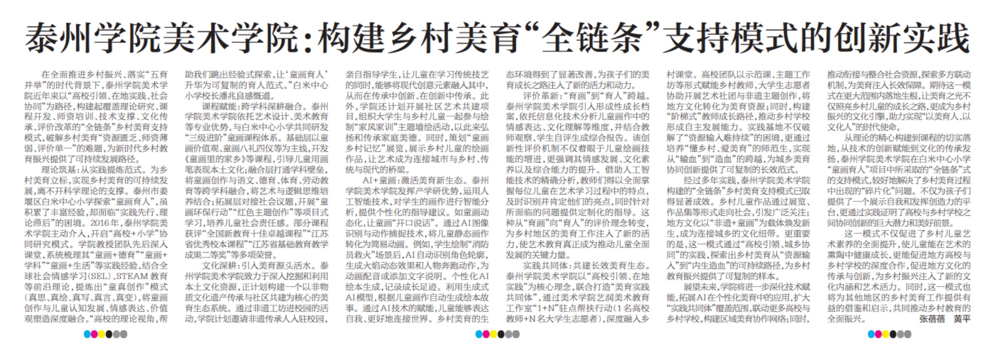 《新华日报》2025年3月29日报道《sunbet申搏官方网站美术学院:构建乡村美育“全链条”支持模式的创新实践》
