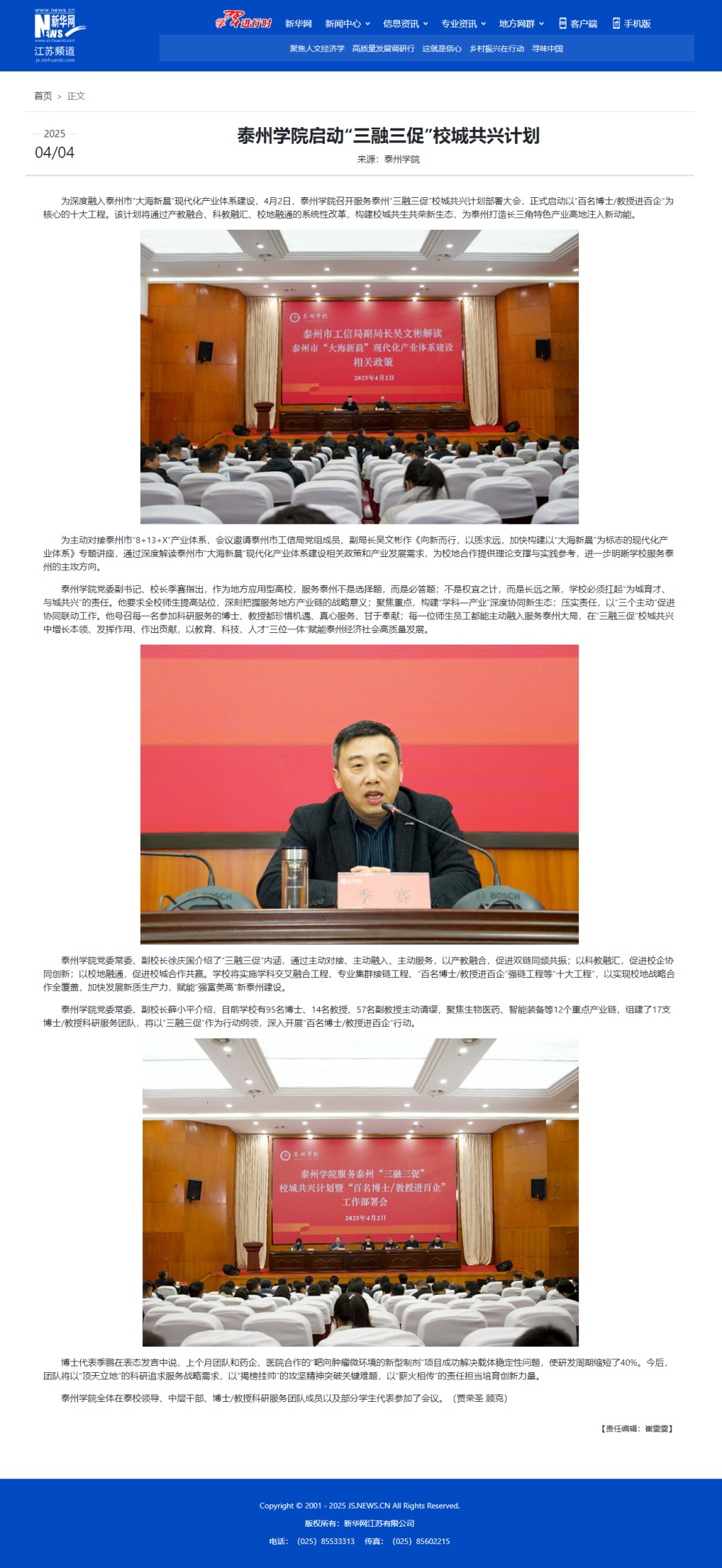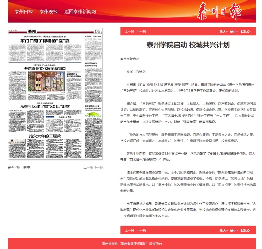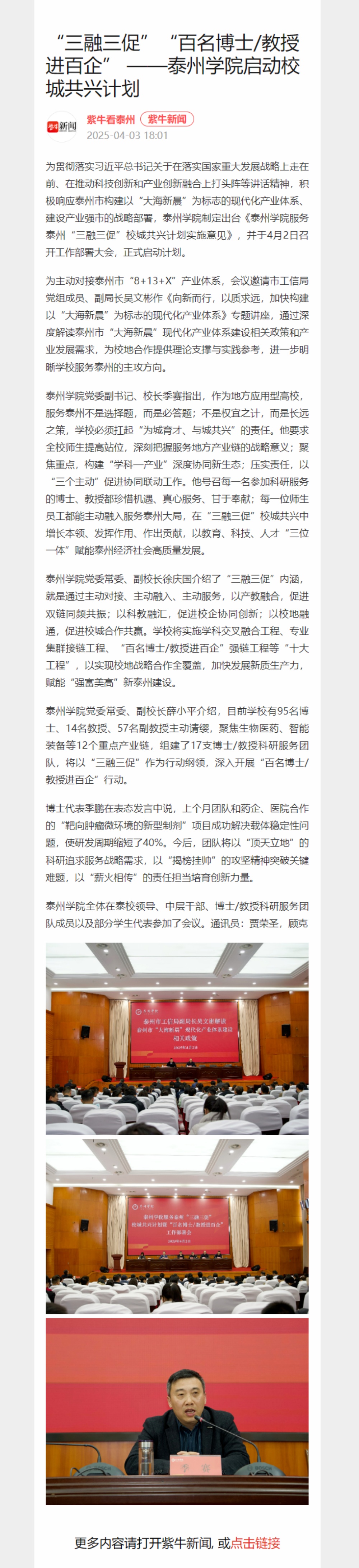 《新华网》《紫牛新闻》《泰州日报》《泰州广播电视台》《新泰州》报道sunbet申搏启动“三融三促”校城共兴计划