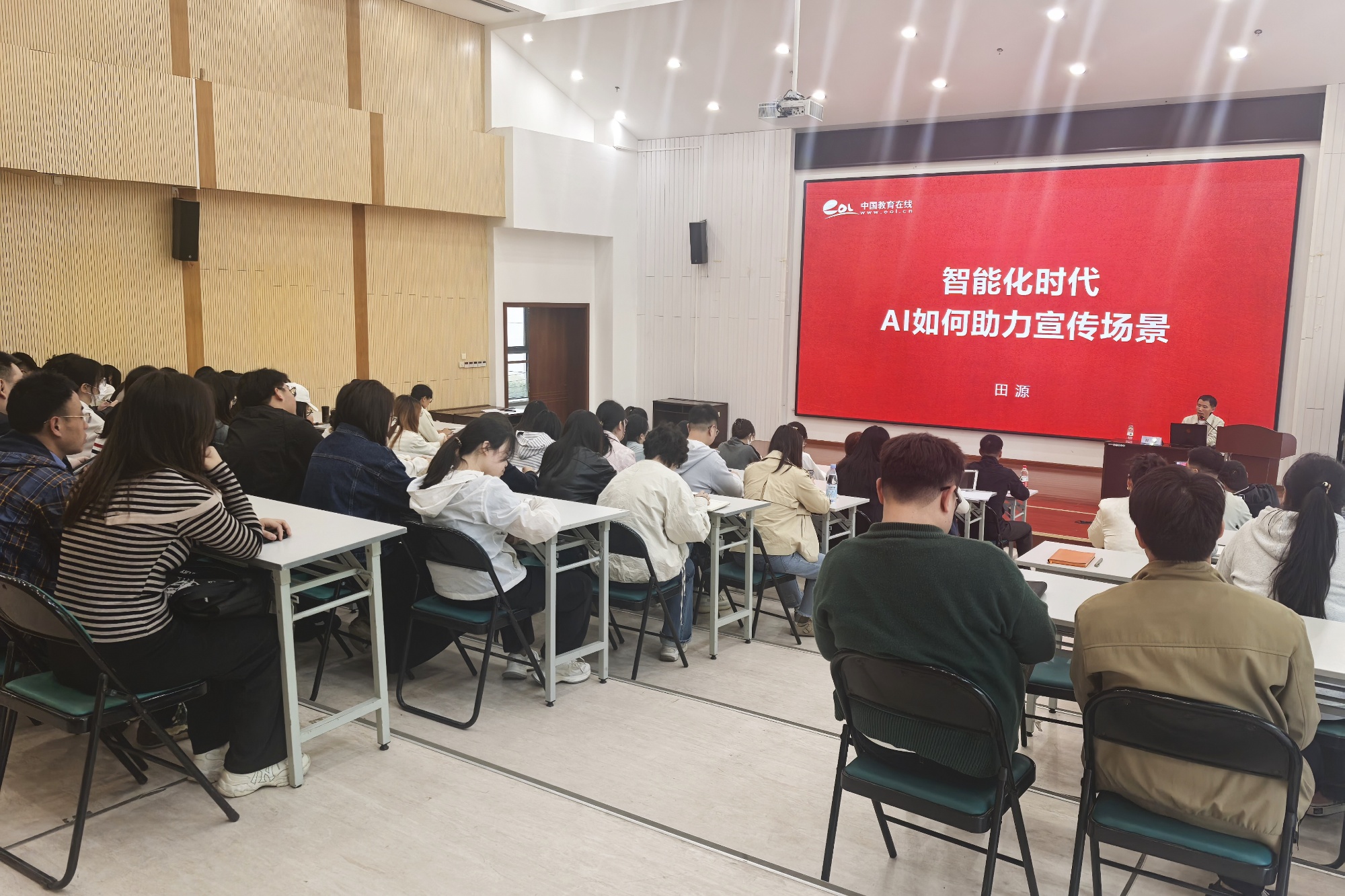 本次讲座邀请中国教育在线AI智能化解决方案专家田源,为现场师生作题为《智能化时代,AI如何助力教育宣传场景》的辅导报告,开展AI在教育宣传领域应用的深度分享。讲座中,田源针对师生通讯员在新闻稿撰写中如何实现“人机协作”、AI设计海报如何避免“千篇一律”、短视频运营里算法推荐与内容创意怎样找到平衡点等实际问题,结合真实案例进行深入剖析,详细解读了AI在教育宣传中的优势与局限,帮助参训师生了解AI在教育宣传中的具体应用方式,理解“技术赋能”的底层逻辑。