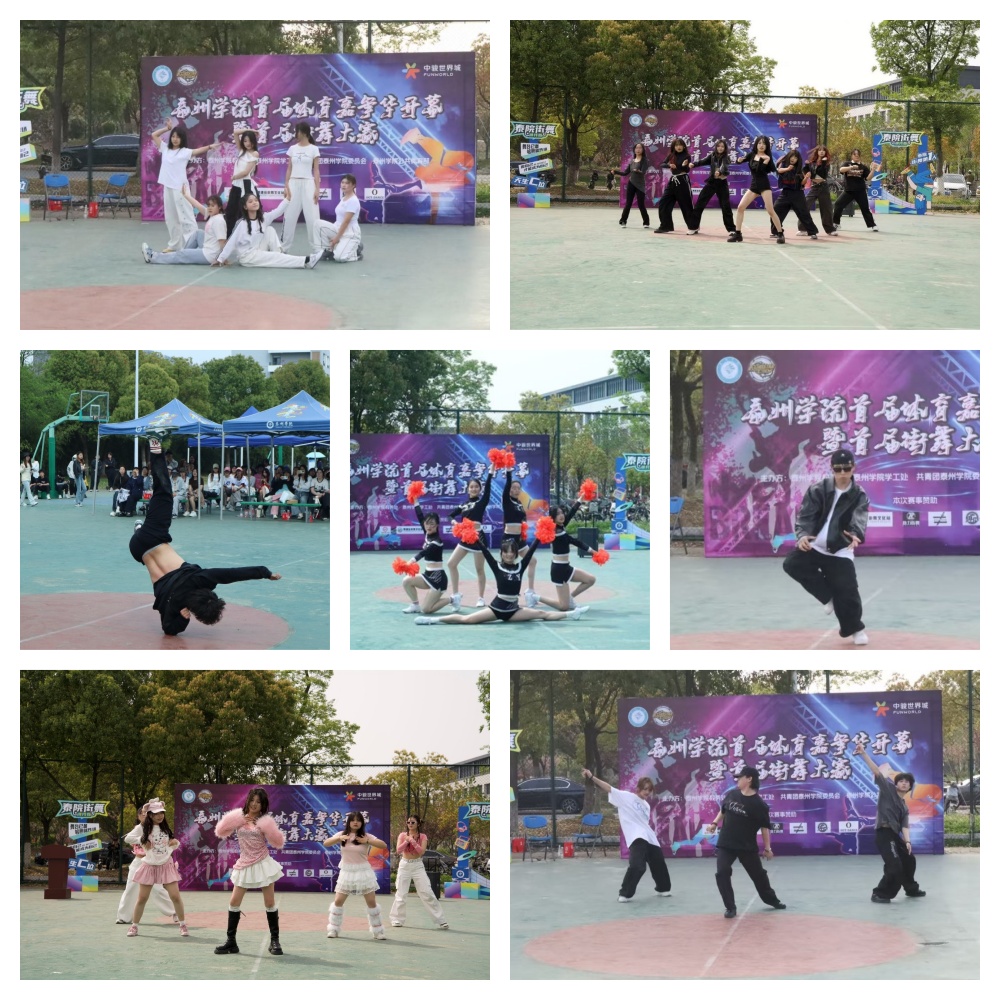 开幕式融合传统文化与现代元素。校武术队表演非遗项目《龙腾泰院》,啦啦操队展示团体造型,街舞社团呈现融合Hip-hop风格的舞蹈作品。活动核心环节街舞大赛共吸引全校30支队伍参赛,设置Battle(斗舞)、双人对决、齐舞等竞赛单元,由泰州街舞联盟创始人邹知辰等专业人士组成裁判团。教育科学学院、外国语学院代表队分获不同组别优胜。