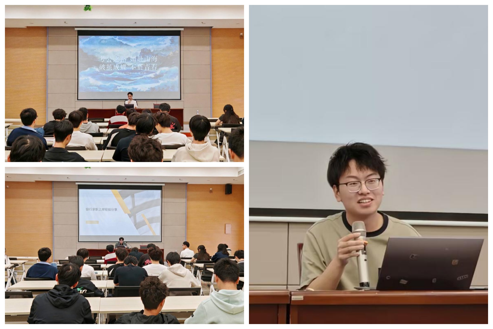 分享会上,三位学长倾囊相授。刘晋嘉剖析银行招聘全流程,结合案例阐释银行运营思路,助力同学们直观了解银行工作。梁丞铭围绕国考省考备考,指出要将纸质书与网课结合,多练习申论真题,建立自信。吴大卫强调实习的价值,称其不仅可以积累经验,更是提升技能的良机,他还鼓励同学们参与志愿活动培养综合能力。