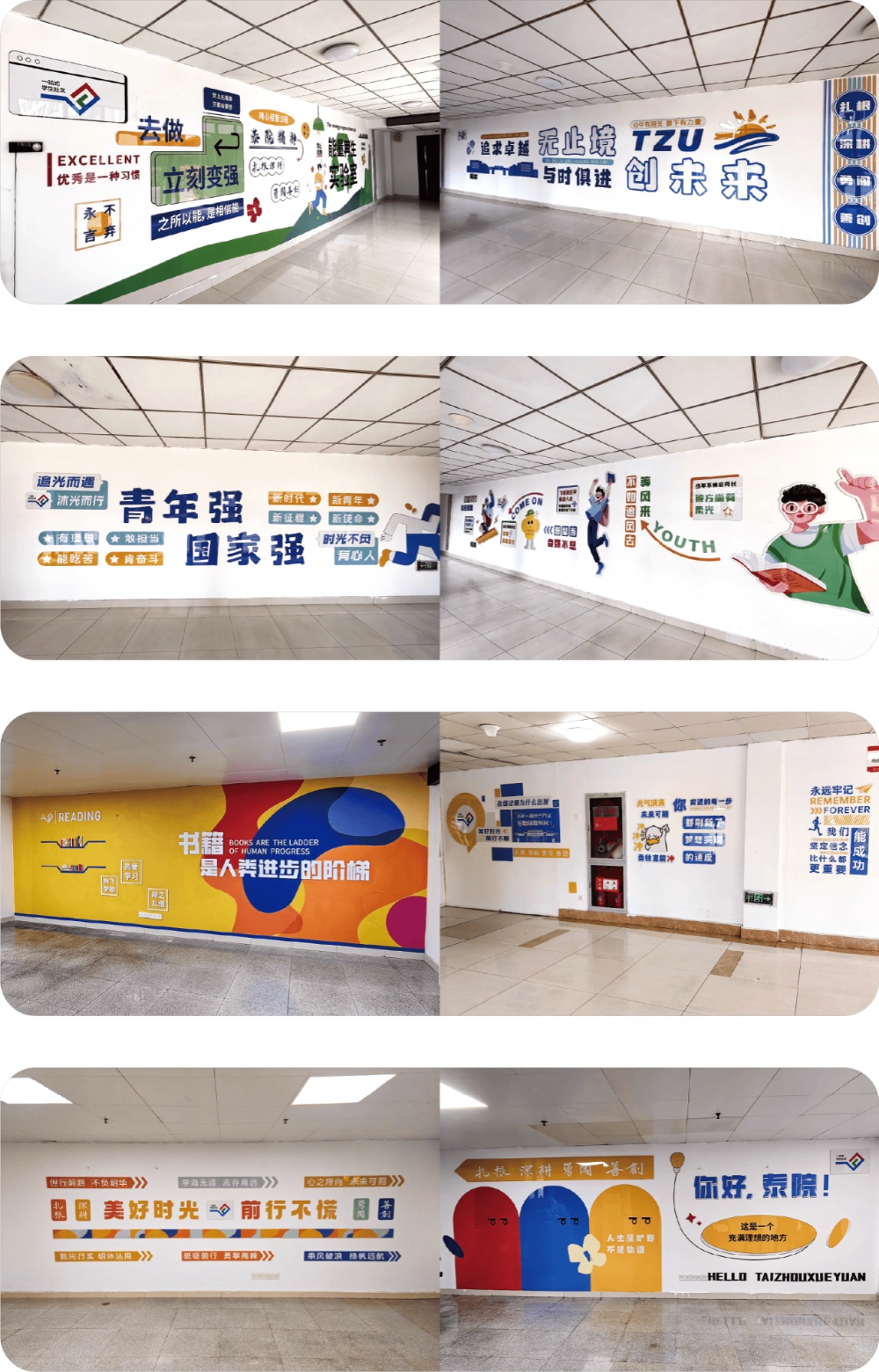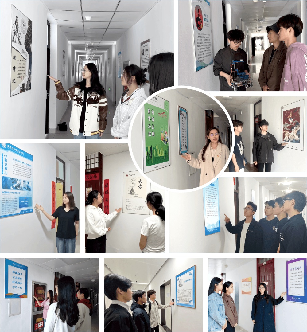 “一院一品”凸显特色:人文学院“二十四节气”彩绘解码农耕智慧、数理学院几何艺术墙演绎理性之美、美术学院水墨墙呈现东方美学意境、医药与化学化工学院用分子结构装饰门廊传递科研精神,形成“一步一景”的沉浸式育人场域。