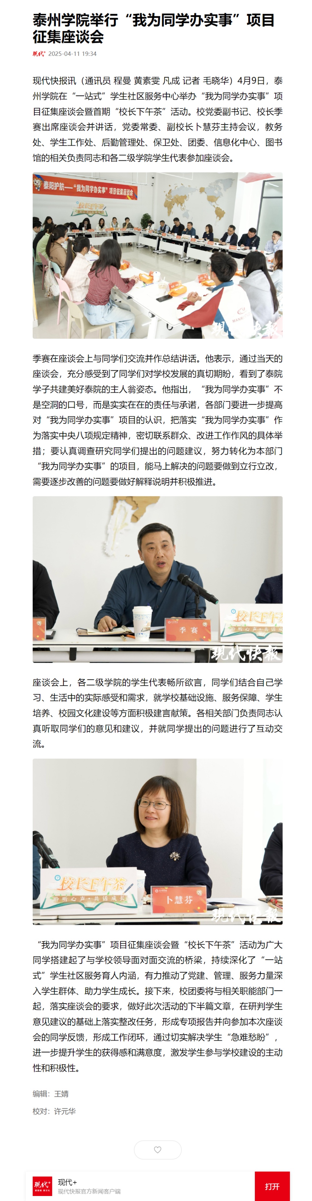 《现代+》2025年4月11日报道《sunbet申搏官方网站举行“我为同学办实事”项目征集座谈会》