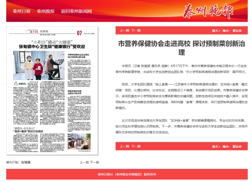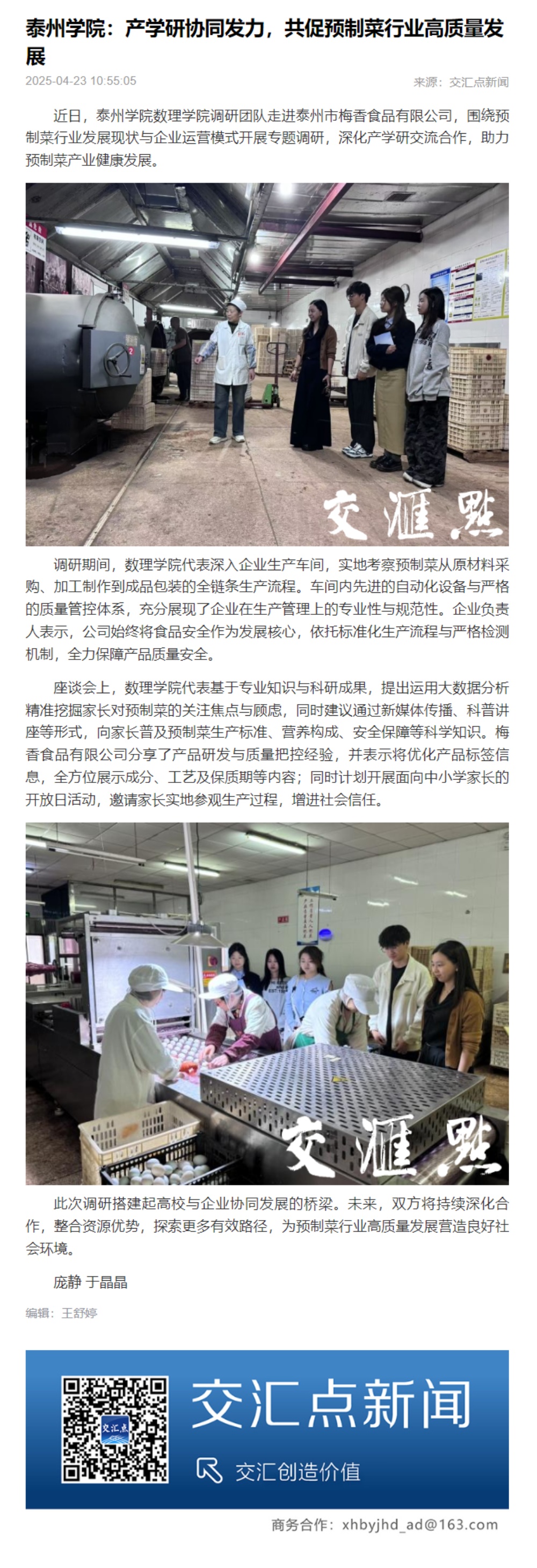 《泰州晚报》《交汇点新闻》2025年4月19日、23日分别报道《sunbet申搏官方网站:产学研协同发力,共促预制菜行业高质量发展》