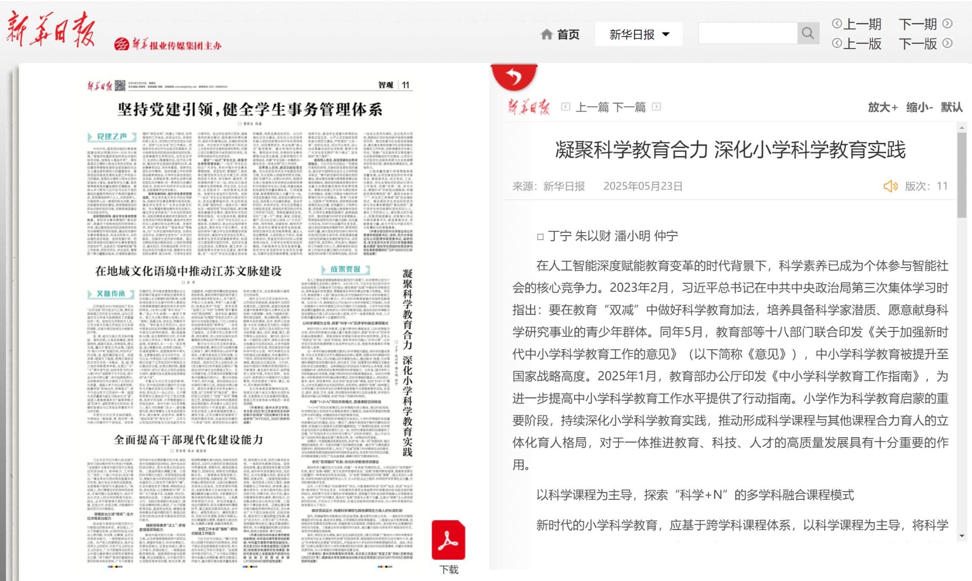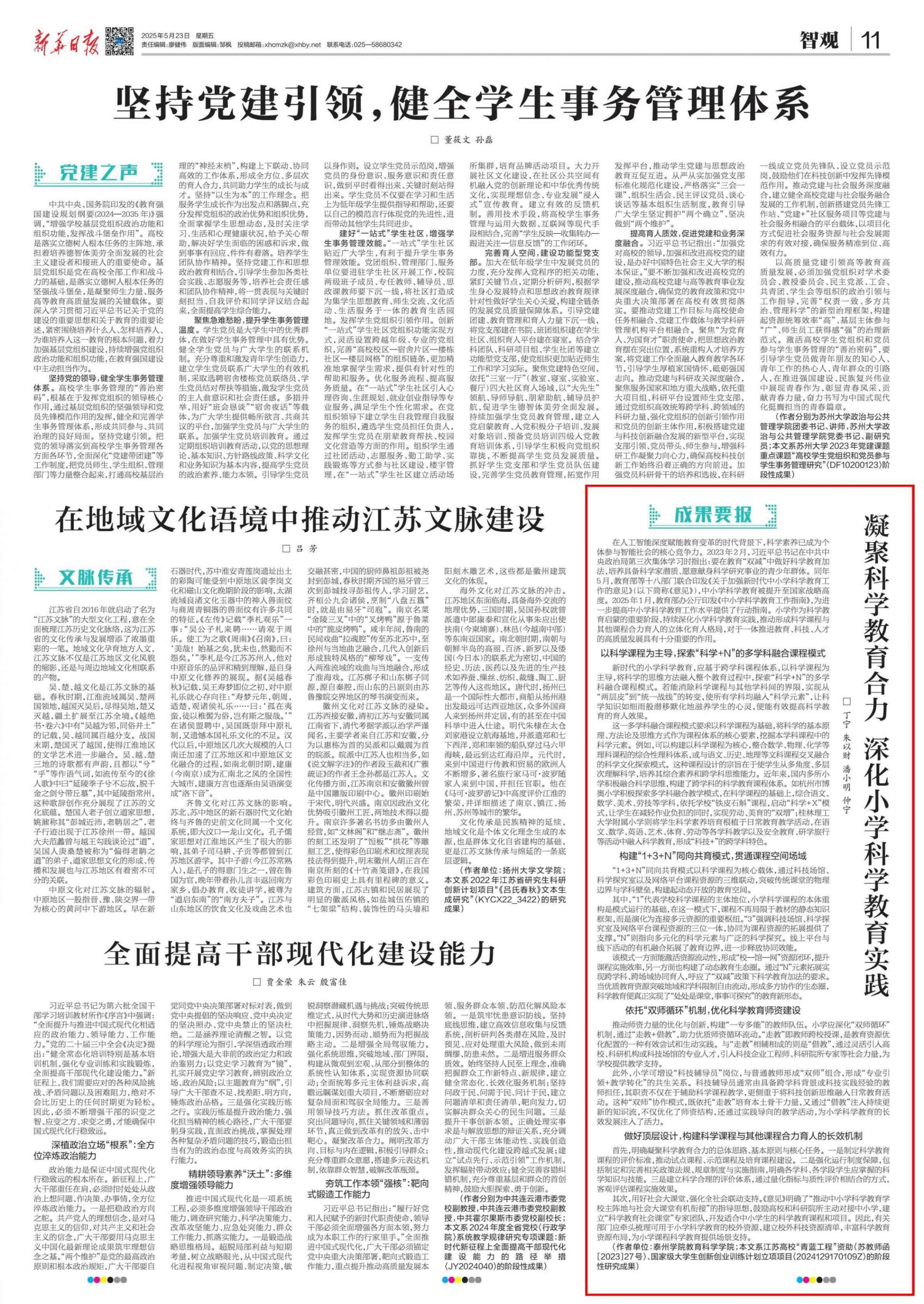 《新华日报》2025年5月23日报道《凝聚科学教育合力 深化小学科学教育实践》