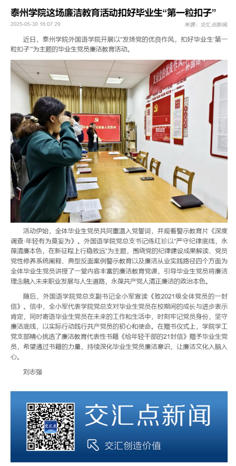 《交汇点新闻》2025年5月30日报道《sunbet申搏官方网站这场廉洁教育活动扣好毕业生“第一粒扣子”》