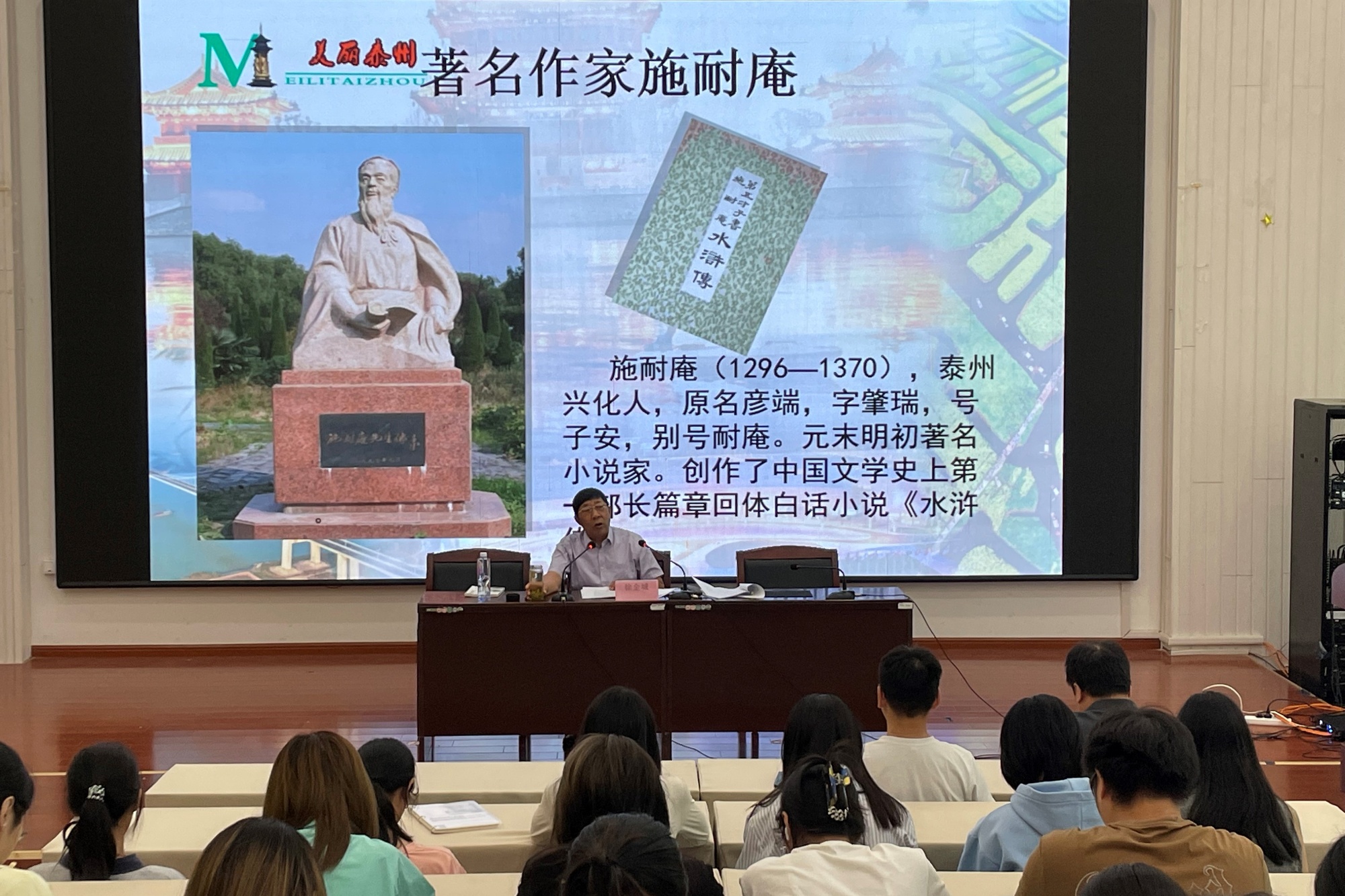历史文化讲座:在名人故事中筑牢文化自信。徐金城教授首先带来“泰州历史文化”专题讲座。讲座以“增强文化强国自信”为核心,聚焦范仲淹、施耐庵、郑板桥等10位泰州历史名人,从他们的生平事迹、思想成就切入,生动讲述了名人笔下的泰州风骨与历史担当。讲座中,徐金城教授通过剖析名人与泰州地域文化的深层联结,引导美术学院学生从历史文脉中汲取创作灵感,在艺术实践中传承文化基因。