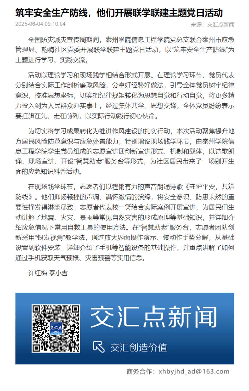 《交汇点新闻》2025年6月5日报道《筑牢安全生产防线,他们开展联学联建主题党日活动》