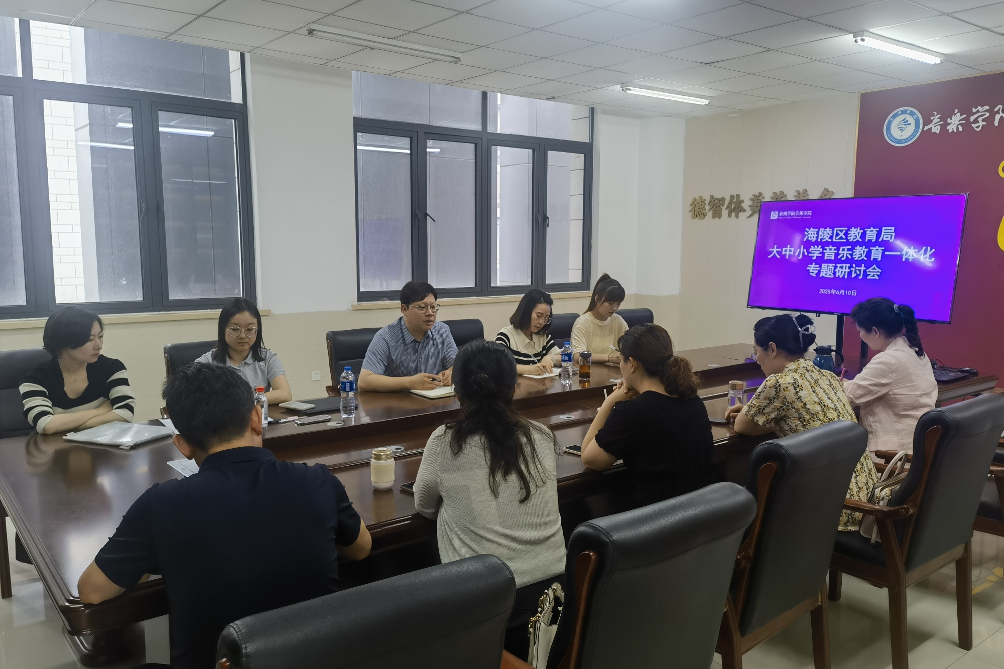 6月10日下午,海陵区教育局音乐教研室主任陈亚彬带领海陵区部分音乐骨干教师来sunbet申搏音乐学院开展大、中、小学音乐教育一体化专题研讨会。音乐学院院长孙菡、副院长蒋进、音乐学专业负责人闫昱及相关教研室主任参加研讨。