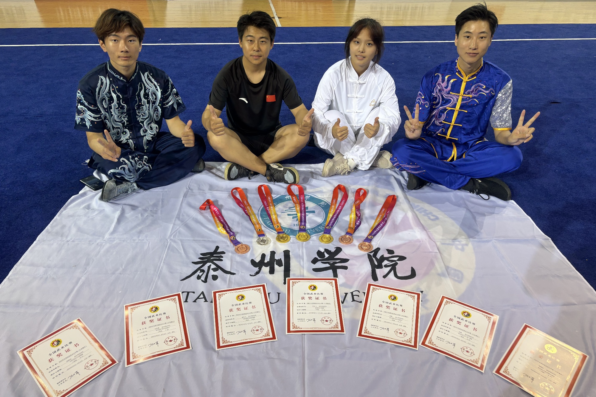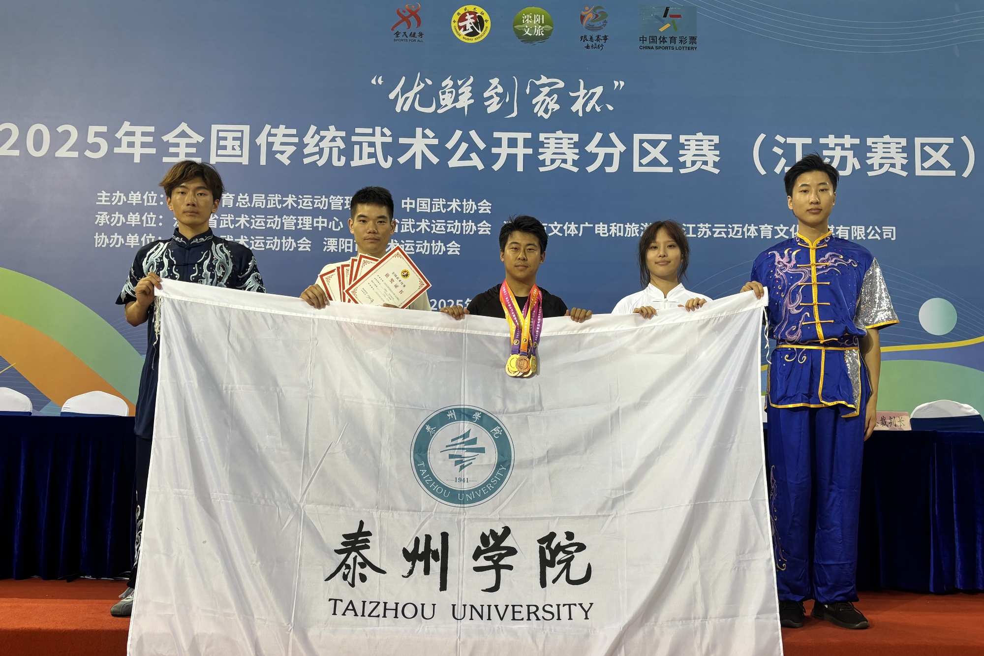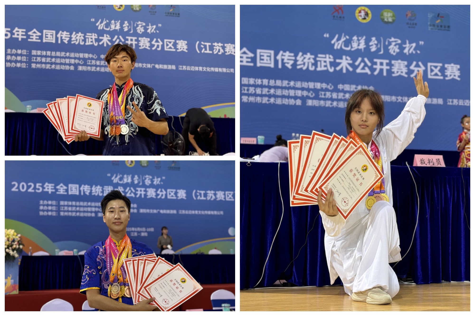 本次比赛由公共体育部(体育系)主任赵益鑫担任领队,景奕飞与陈啸担任教练员。比赛中,sunbet申搏青年教师景奕飞获得一等奖两项并获得直通全国总决赛的比赛资格,刘晨以8.82分获得男子双刀冠军、杨毅冰获得三等奖两项、孔鲁德获得三等奖一项。sunbet申搏学子技术规范,情绪昂扬,展示了精湛的武技,点燃了在场人们热爱中华武术的激情,深刻诠释了“扎根 深耕 勇闯 善创”的泰院精神。