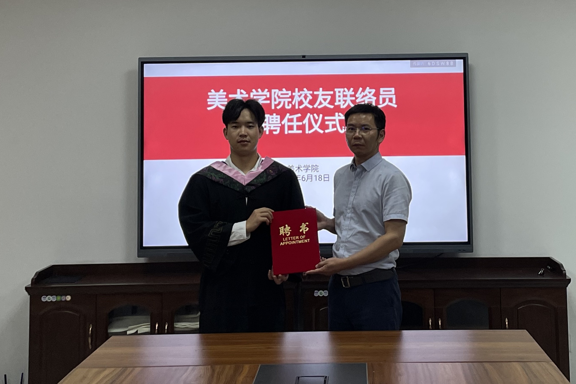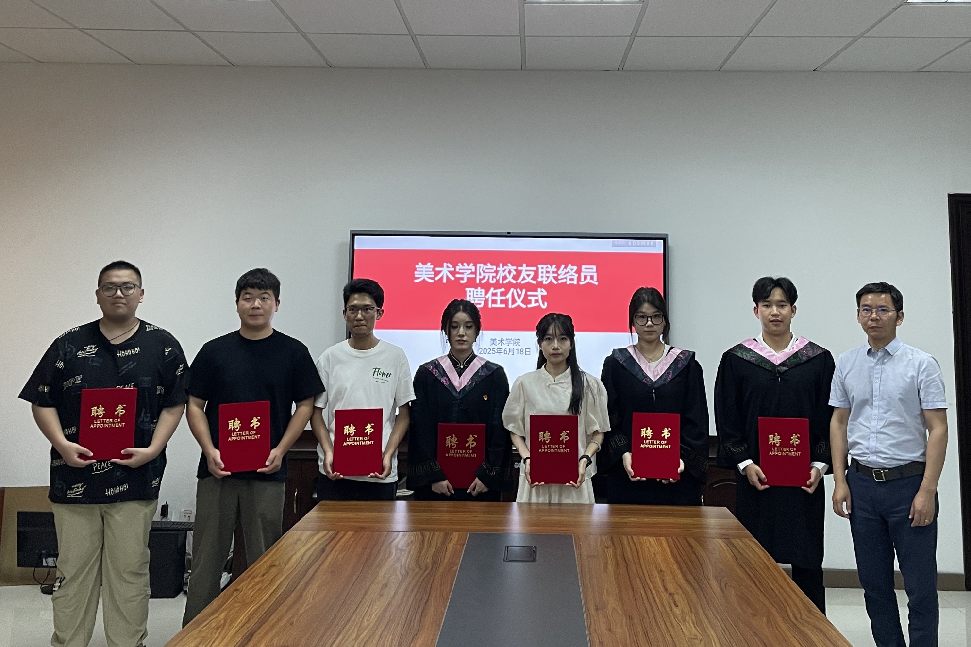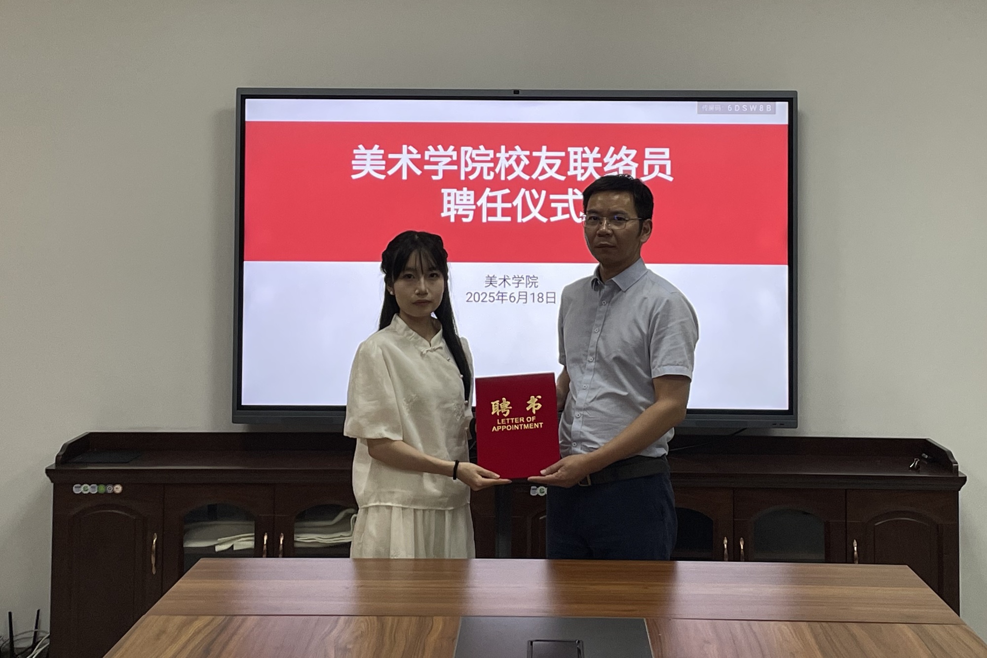 传递美院情谊,勇担联络使命。在校友联络员聘任仪式环节,吴新林为选拔的毕业生校友联络员代表颁发聘书,并亲手佩戴绶带。聘书传递的不仅是一份荣誉,更是母校对毕业生党员的殷切信任与深切嘱托。吴新林对新任联络员深情寄语:“这枚聘书,承载着母校与校友之间的深厚情谊,是连接彼此的重要纽带。希望你们充分发挥桥梁作用,让泰院精神在祖国各地生根发芽、熠熠生辉,携手共绘学院发展的崭新蓝图。”