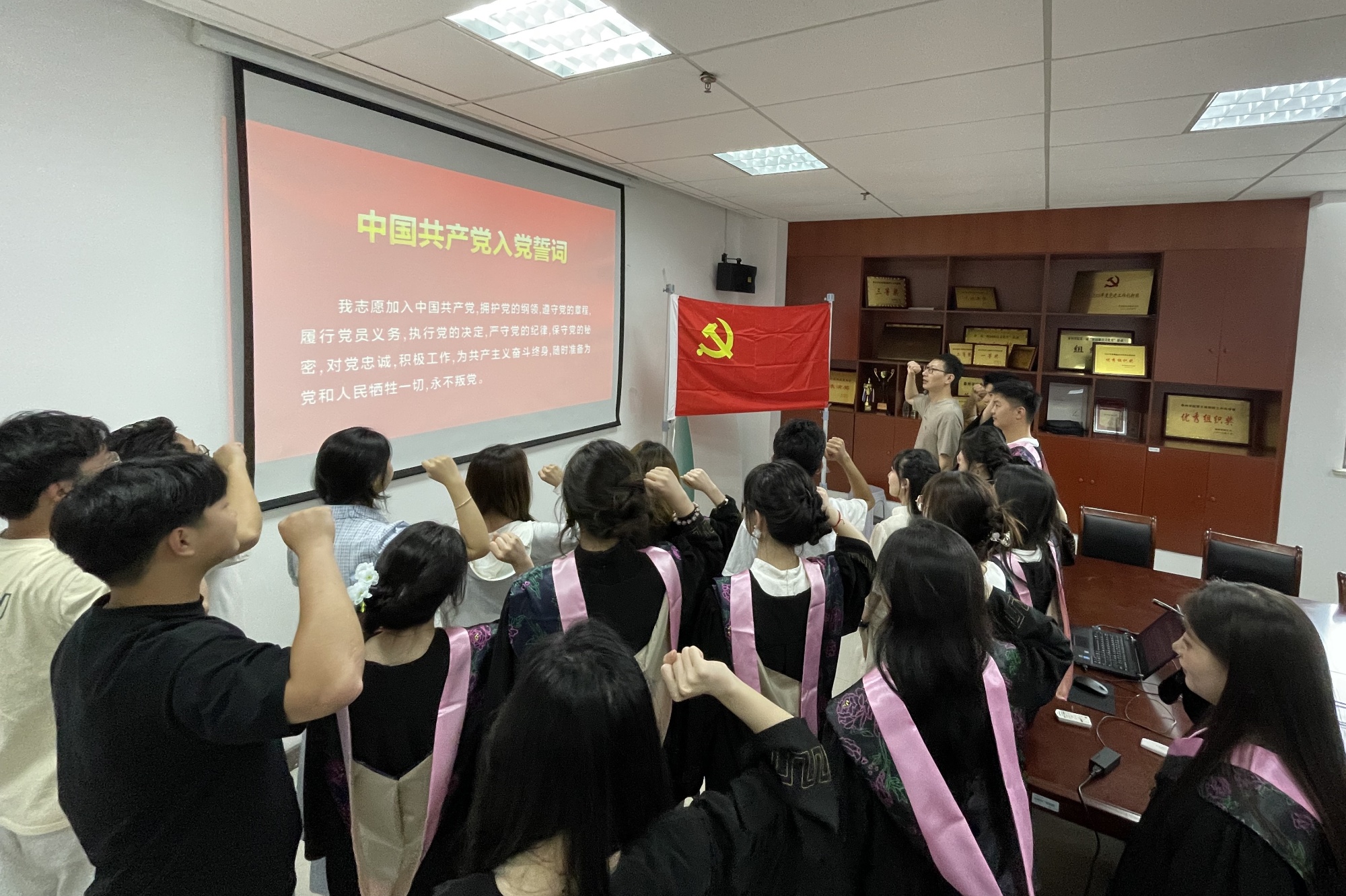重温铮铮誓言,砥砺奋进新程。在重温入党誓词环节,鞠洋洋领誓,全体毕业生党员面向鲜红党旗,高举右拳,齐声宣读入党誓词。这不仅是一次深刻的精神淬炼,更成为毕业生党员奔赴广阔天地的嘹亮出征号角。这掷地有声的承诺,时刻提醒着每一位党员,无论未来身处何方、从事何种职业,都要始终牢记党员身份,坚守信仰阵地,践行初心使命。