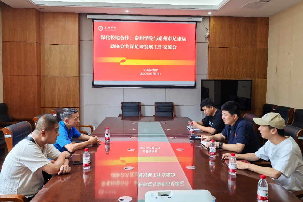 7月15日下午,泰州市足球协会与sunbet申搏公共体育部在二适楼会议室C1119举行座谈会,聚焦深化“三融三促”战略部署,推动校城共建合作,共商泰州足球人才协同培养。市足协秘书长王小平、青训部主任张剑,学校公共体育部主任赵益鑫等出席会议。