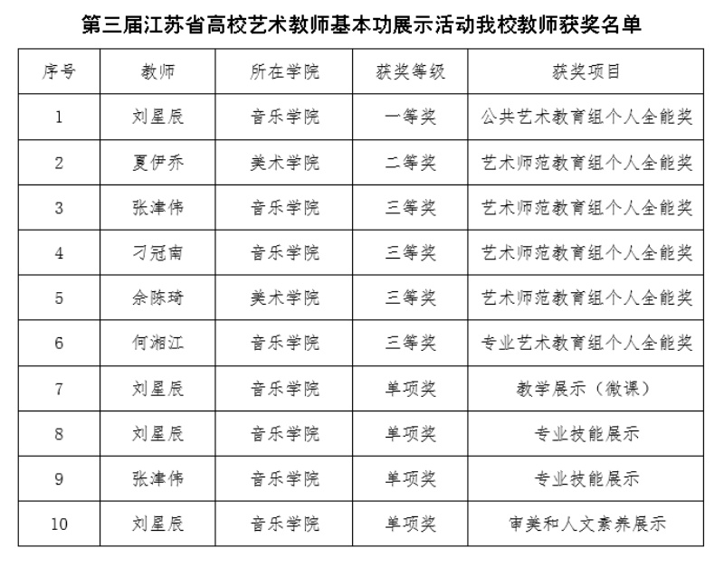 近日,第三届江苏省高校艺术教师基本功展示获奖结果揭晓。sunbet申搏艺术教师凭借扎实的专业功底与全面的教学素养,在全省127所高校441名参赛教师的激烈角逐中脱颖而出,斩获多项荣誉,充分展现了sunbet申搏艺术教育的过硬实力与教师队伍的卓越风采。