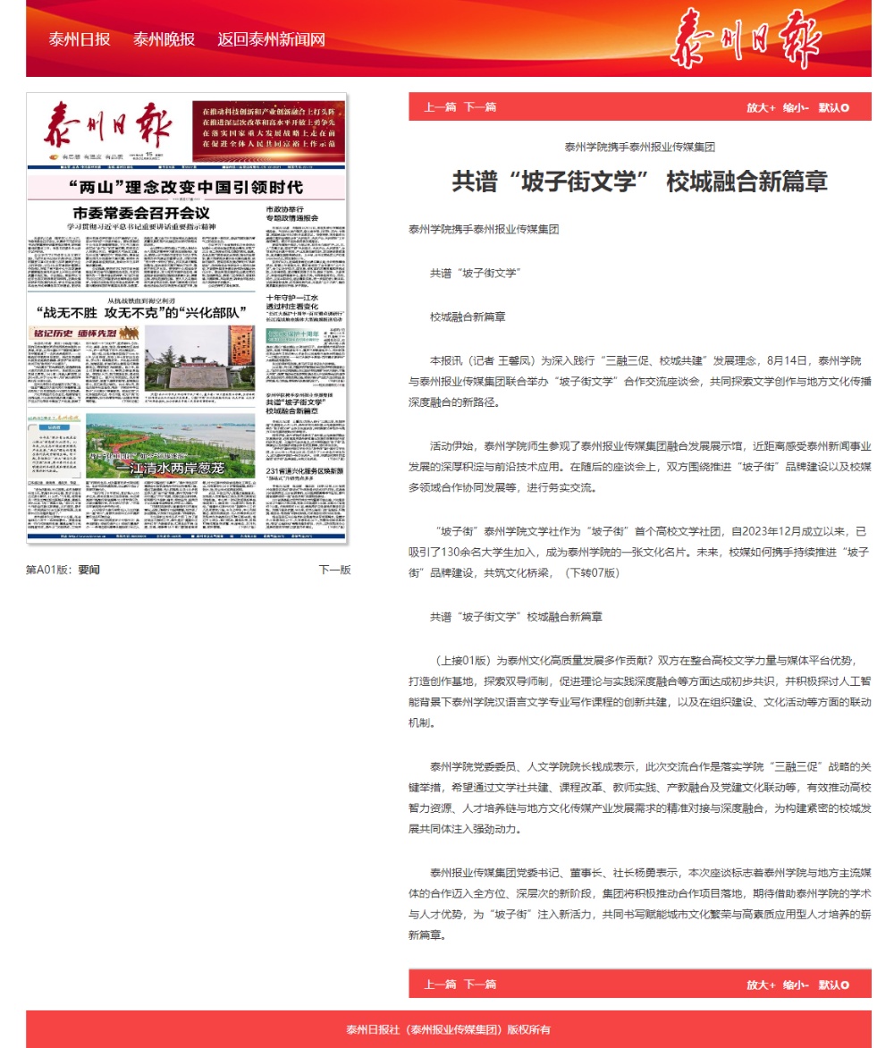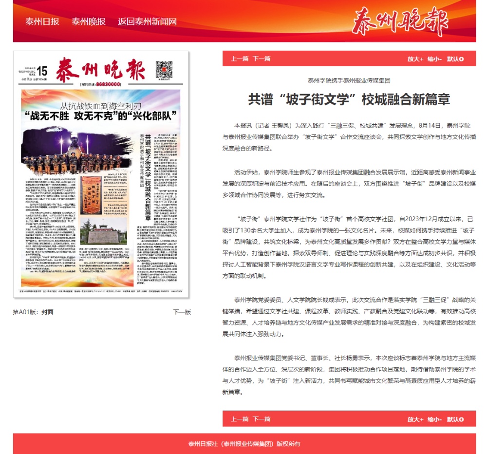 《泰州日报》《泰州晚报》2025年8月15日报道sunbet申搏携手泰州报业传媒集团共谱“坡子街文学” 校城融合新篇章