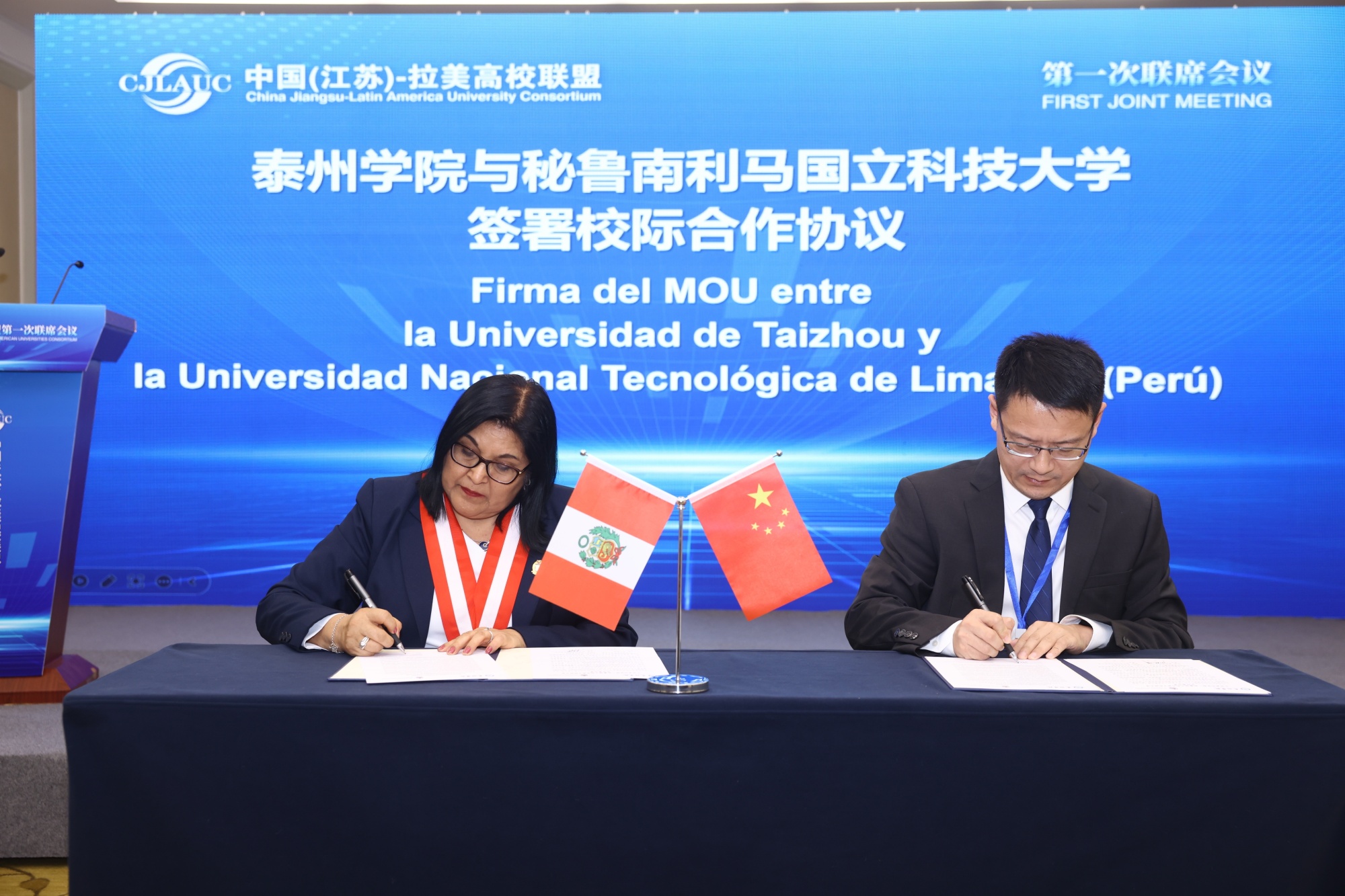 在联盟会议期间,汤艳峰代表学校在大会作报告并与秘鲁国立利马南方科技大学签署合作协议,标志着两校正式确立友好合作伙伴关系,双方将在师生互访、课程联合开发、学术研讨及产业服务等领域开展深度合作。中国(江苏)—拉美高校联盟高校成员共同见证了这一时刻。