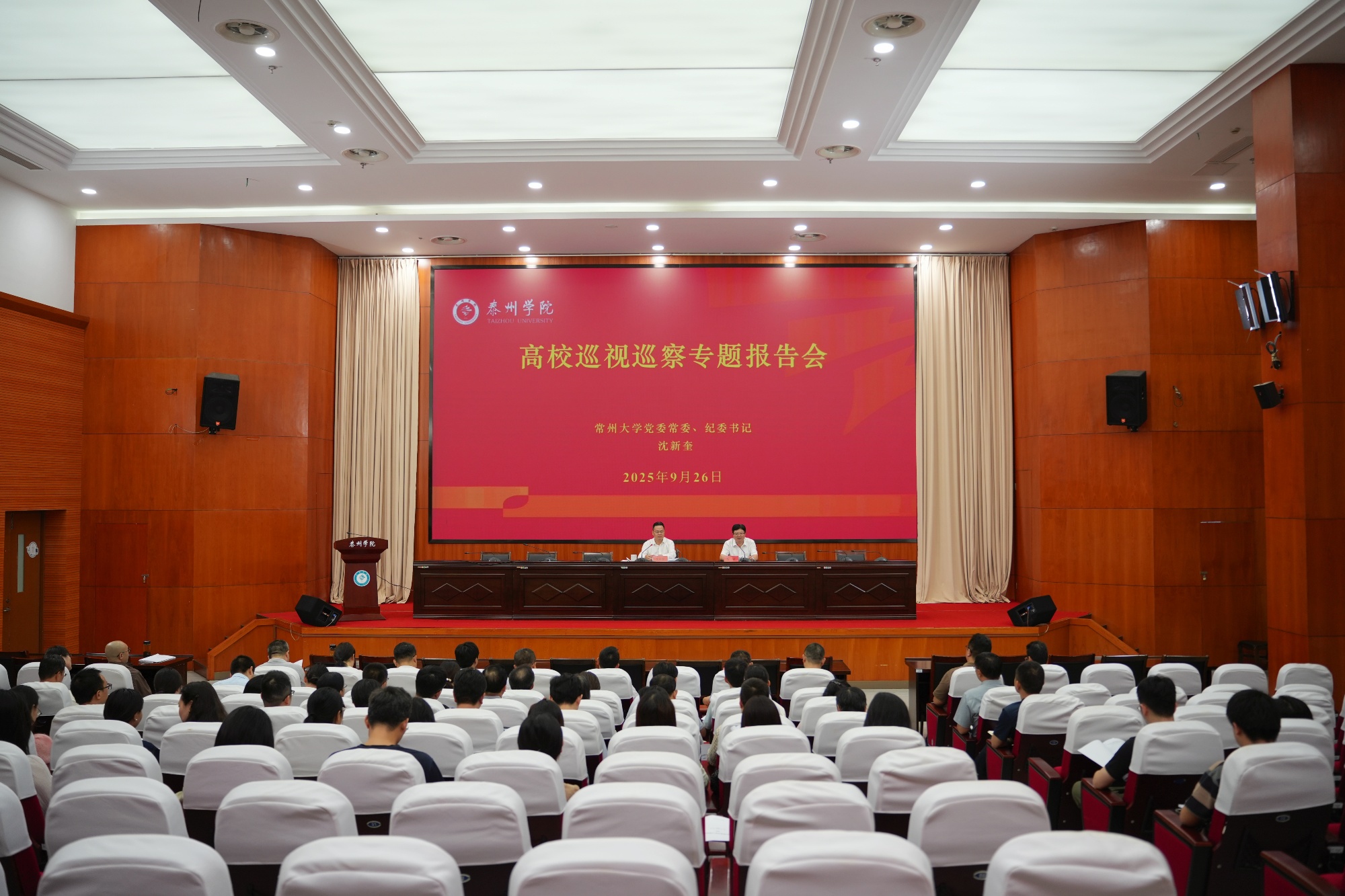 9月26日下午,常州大学党委常委、纪委书记沈新奎应邀在学校明达楼D1216作高校巡视巡察专题报告,校党委常委、纪委书记何军主持会议。校纪委委员,二级学院党组织主要负责人,二级党组织纪检委员,特约监察员,巡察组全体成员,被巡察单位党政负责人,党委组织部、纪委办公室、党委巡察办公室全体同志参加会议。